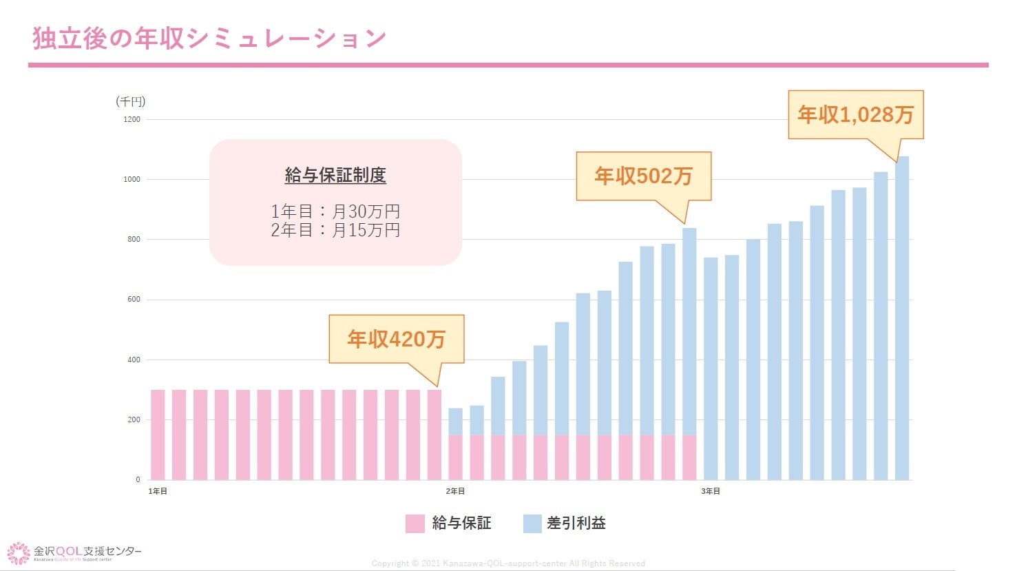 起業に際しては収入面のリスクで躊躇される方も多いと思います。当プログラムでは、起業後1年目は給与を保証することによりそのチャレンジを応援する仕組みをつくっています。起業後、健全な事業所運営を経ることができれば徐々に利益が生まれ、起業後2、3年目にはオーナー収入は上がっていく仕組みとなっており、病院や介護・福祉施設での勤務では得られない成果に見合った報酬を創出することも可能になっております。