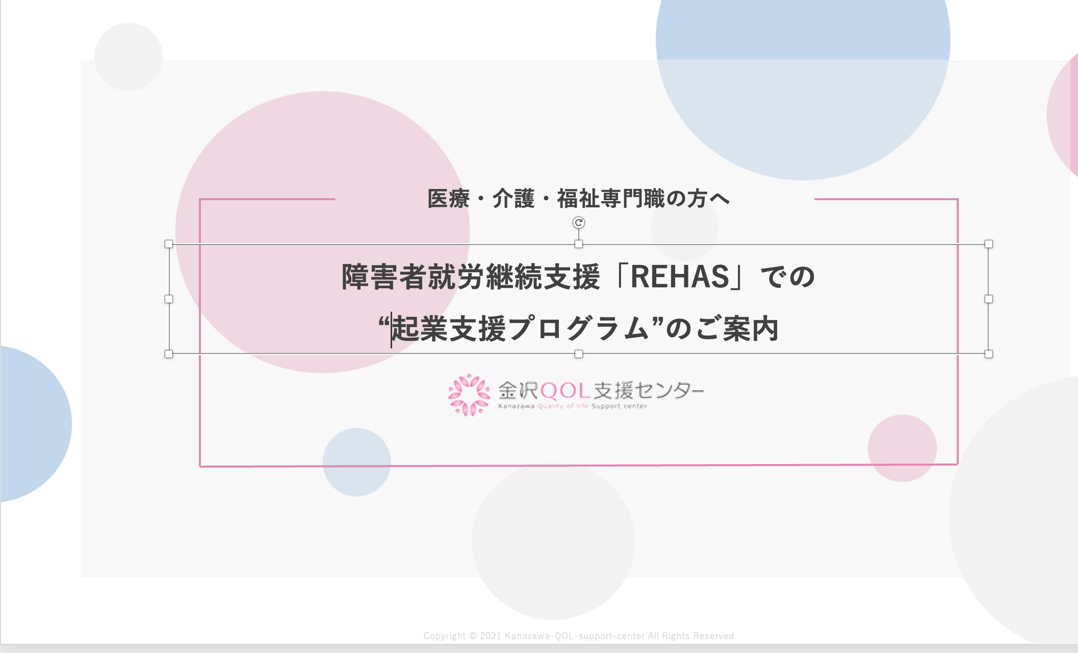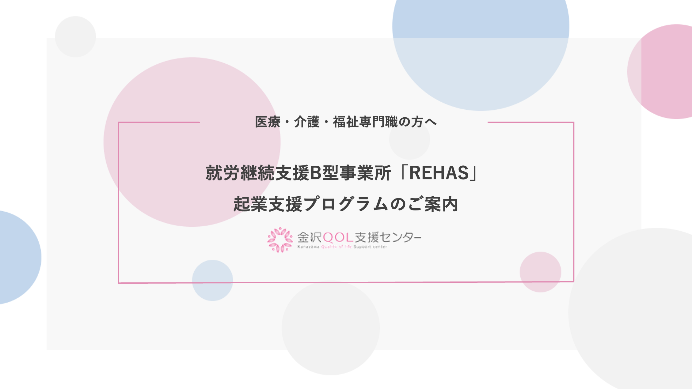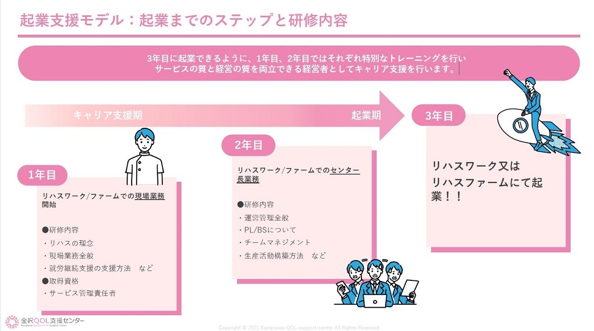 「福祉が地域を⽀える社会の実現」というビジョンを掲げ、医療や介護が必要な⽅であっても働ける事業所やサービスを運営・提供する、金沢QOL支援センター株式会社(本社:石川県金沢市、代表取締役:岩下琢也)は、キャリアアップや起業を考えている医療福祉専門職の方を対象に、起業支援プログラムを創設したことをお知らせいたします。