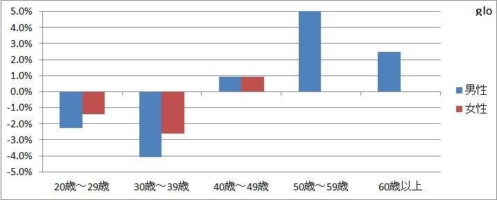 回答者の年齢別男女の数を表にしたものです。また、回答者全体の比率と、グローと回答した人の比率を比較し、プラスマイナスで誤差を示しているのが下記グラフです。