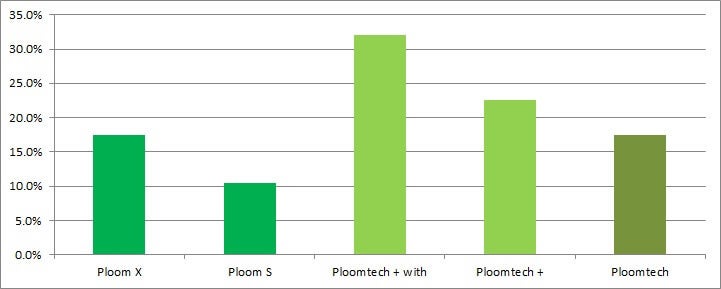 アイコスは回答者全体の比率との誤差が1%前後しかなく、幅広い世代に支持されていることがわかります。続いてプルームを見ていきます。