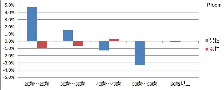 プルームは、20代から30代までが平均値を大きく上回る結果となり、若い世代からの支持は圧倒的。その反面、年齢層の高い世代の使用者が少ないことが明らかになる極端な構成でした。