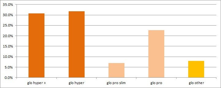 依然トップシェアはアイコスですが、53.4%とだいぶ減っているのがわかります。変わってシェアを伸ばしたのがプルームとグロー、プルームは低温加熱式デバイスも含んだ数値ですが、低温・高温合わせてグローの22.5%を上回る結果となりました。
