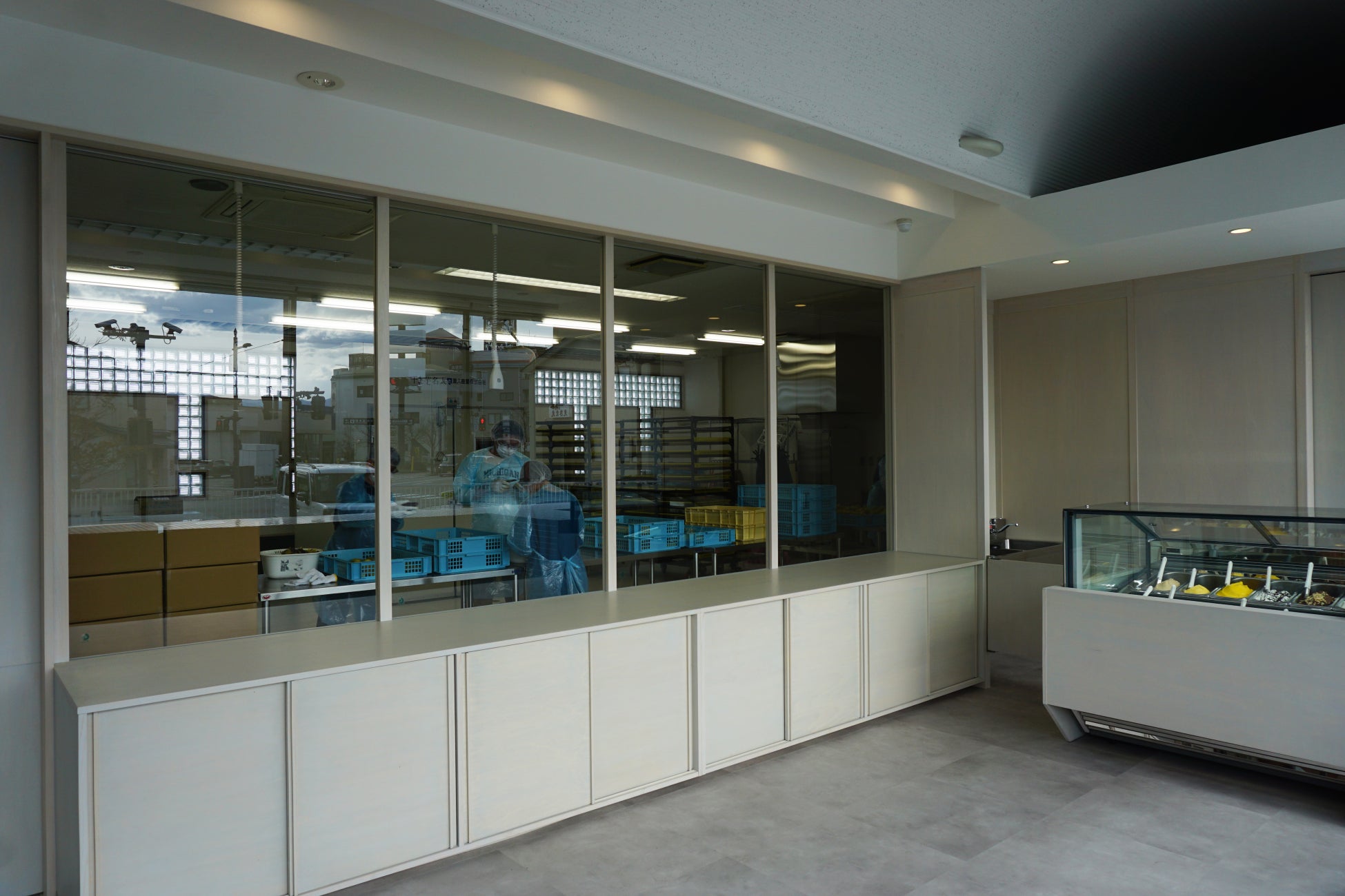 という想いから、直売所や工場の壁をガラス張りにしました。背の低いこどもも見えやすいように、お店と工場を大きなガラスで仕切っています。