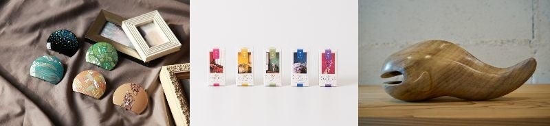 ⾼岡漆器の螺鈿ヘアアクセサリーや金沢箔のジェルネイルなど多彩な⼯芸品や、廃材を使用したSDGsな商品ラインナップ