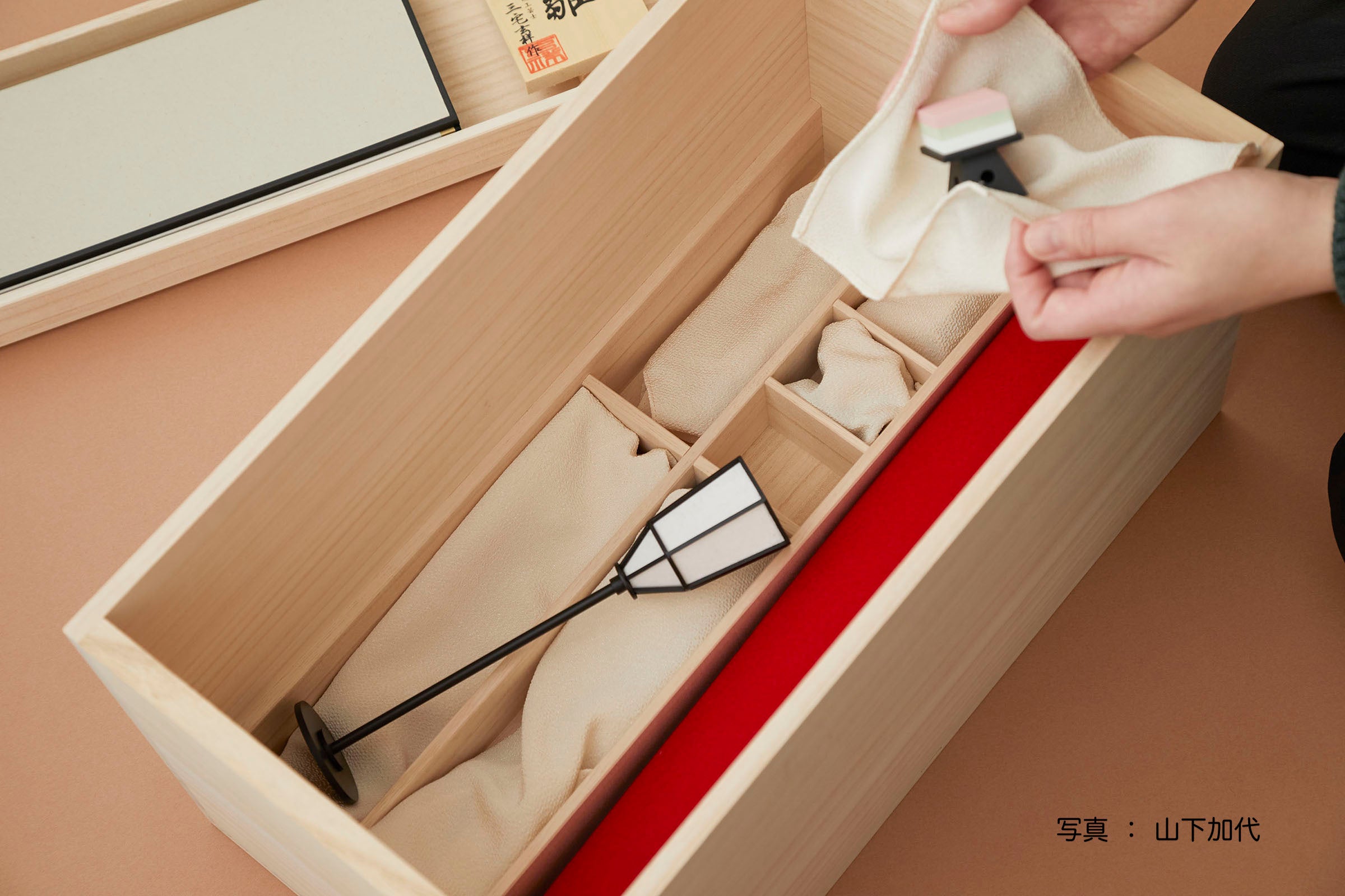 近年、過度に現代的になりがちな衣装は歴史資料にあたって伝統回帰させ、桐箱はコンパクトに設計され全てがきちんと収納されます。 お子様が一生お使いになるにふさわしい、普遍的な二人雛となっております。