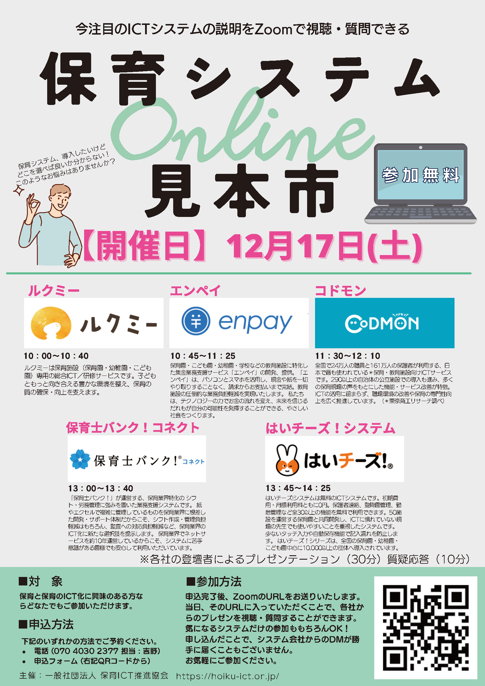 より多くの園にICTをもっと身近に感じてもらい、ICT化の後押しをするため、「保育ICT見本市」としてオンラインイベントを開催いたします。HPや仕様書だけではわからない「システムに込めた思い」や「実現したい未来像」を直接聞くことができるまたとないチャンスです。