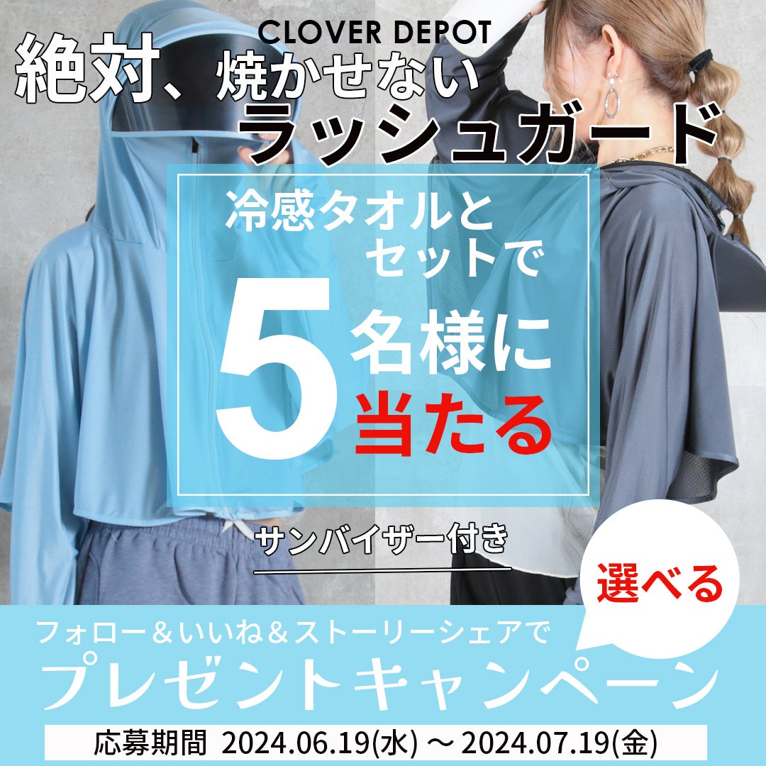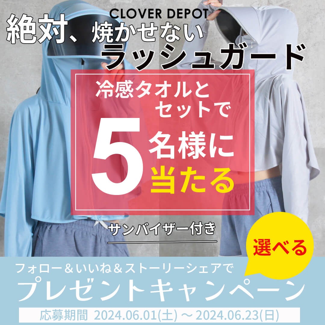 期間中に【cloverdepot.official】【cloverdepot.rakuten】インスタグラムアカウントをフォローし、キャンペーン投稿にいいねをすると、抽選でUVパーカーと冷感タオルが当たるチャンスがあります。夏の日差しから肌を守るために必須のアイテム、UVパーカーと冷感タオルをゲットする絶好の機会です。