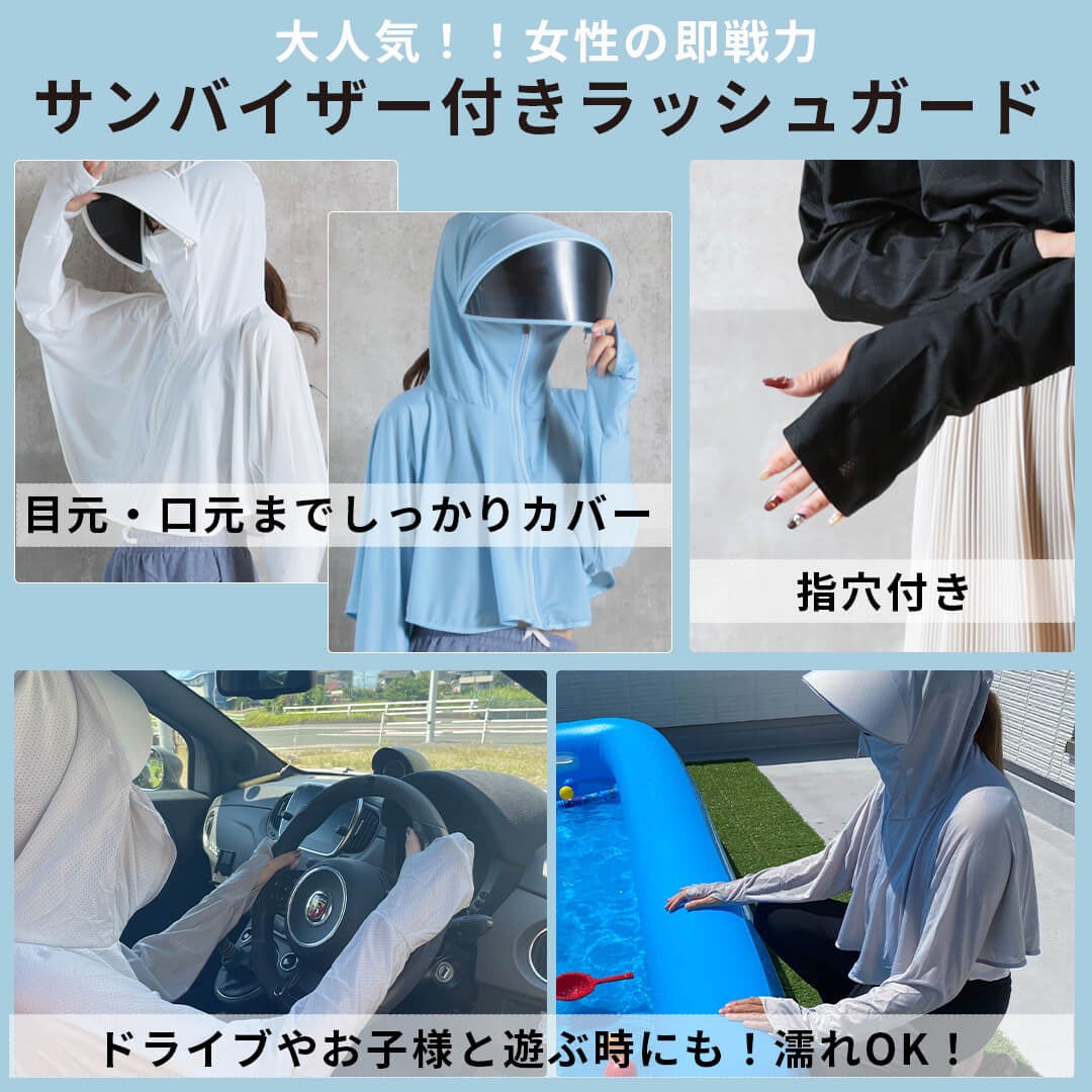 UPF50,冷感素材タイプ、速乾素材、サンバイザー付きで頭から手の甲までしっかりガードの水陸両用タイプ、
