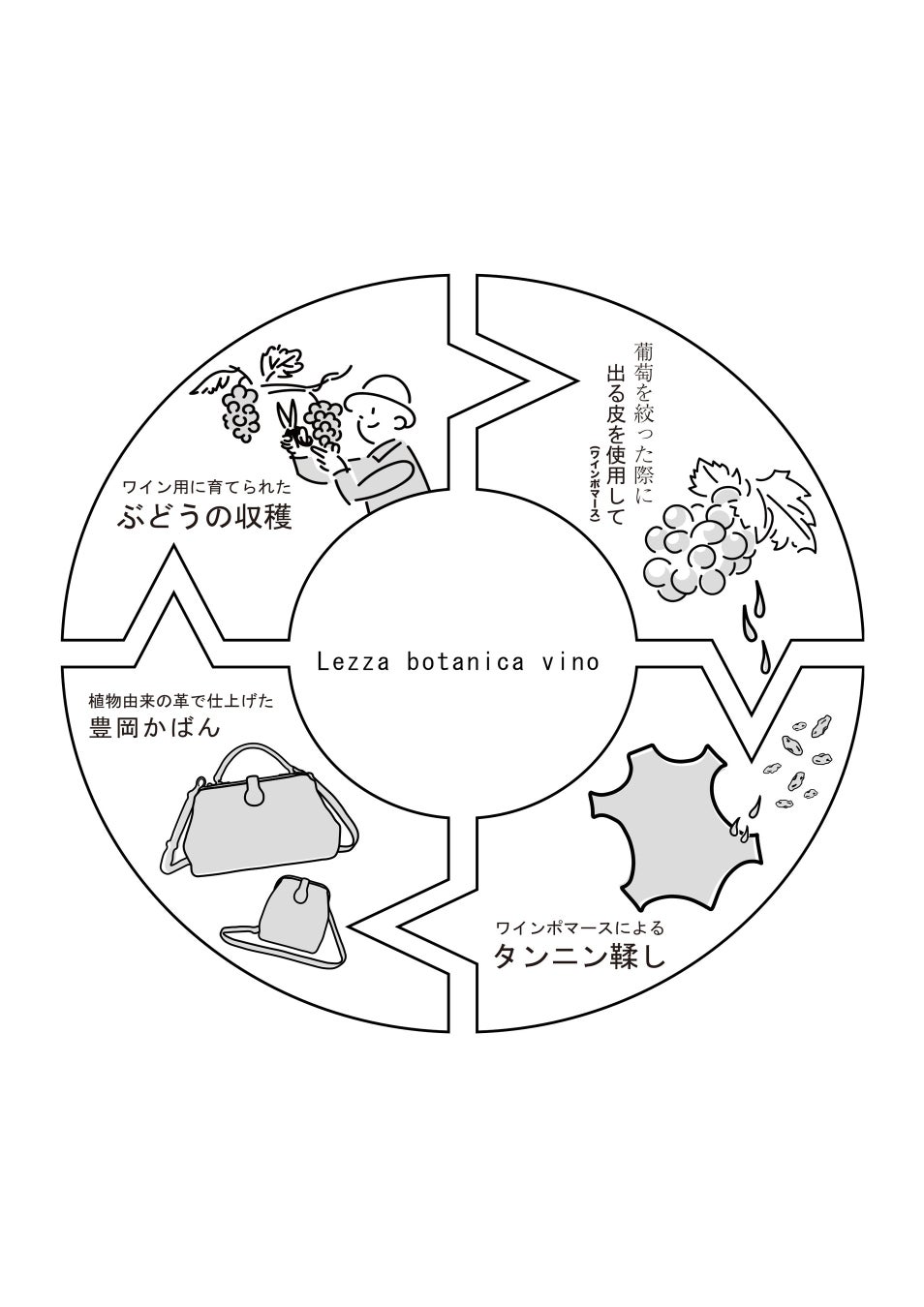 ワインの搾りかすを、タンニン鞣しと染色の一部に使用しています。ワインポマース(絞りかす)に含まれるポリフェノールにより、力強さとしなやかさを備えた革に仕上がっている。ポリフェノールの成分により深みのある色と抗菌・消臭効果があります。今回のLezza botanica vinoは、その搾りかすで鞣し、染色されたレザーを使用しています。普段は捨てられてしまうものを使い、自然に優しい手法で作られたナチュラルレザーのバッグをぜひお手に取ってご覧ください。豊岡鞄シリーズです。