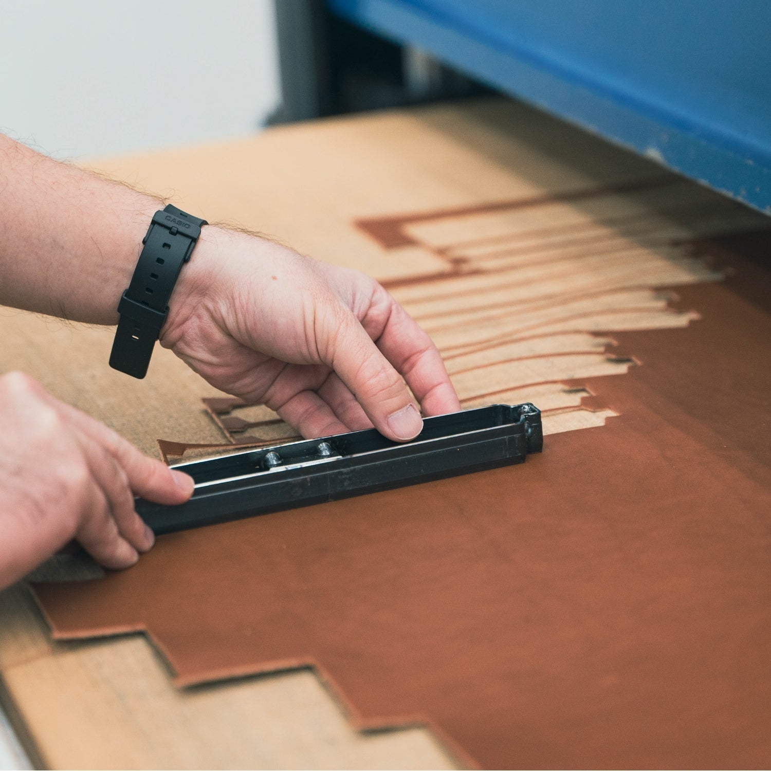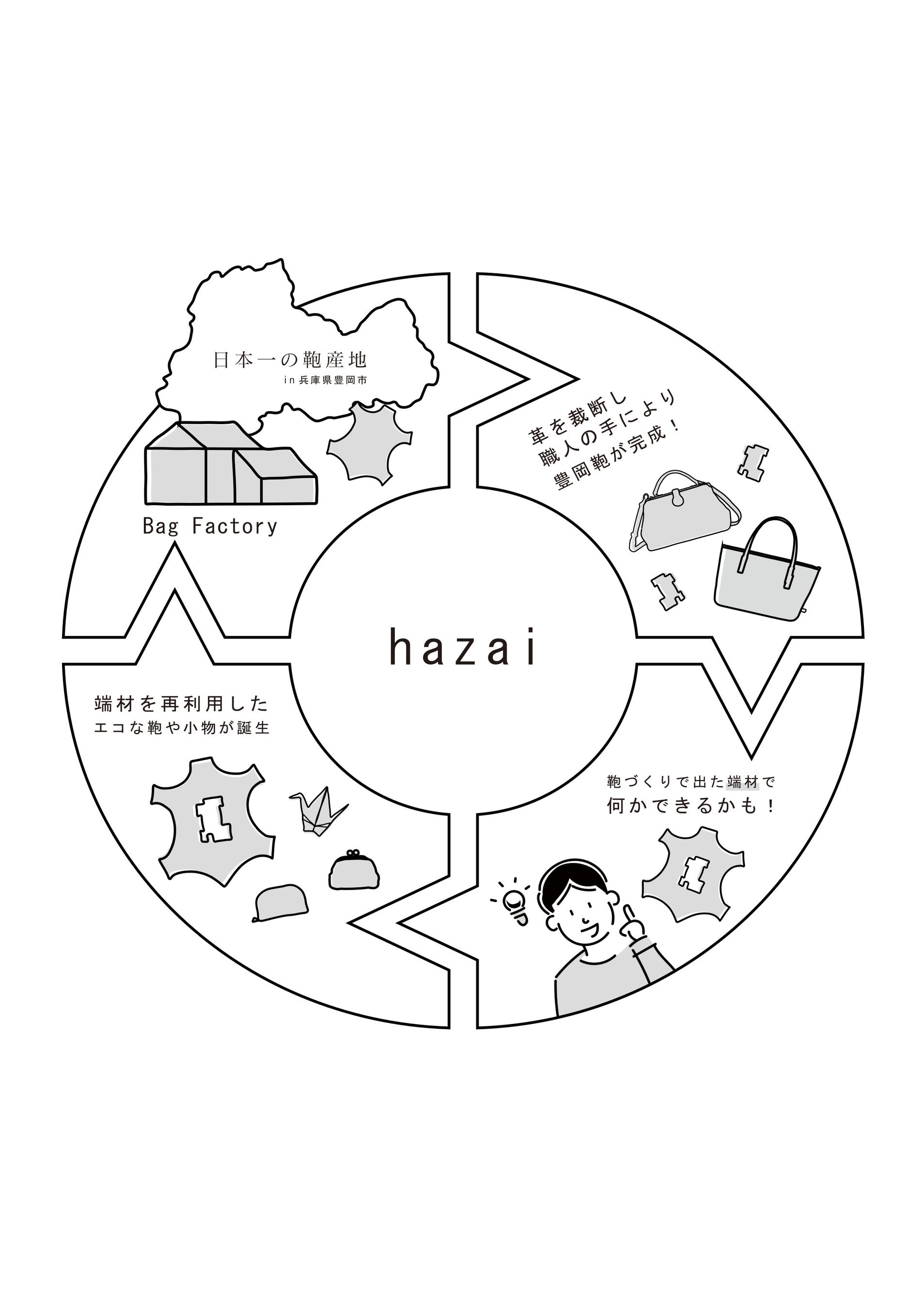バッグを作るためには多くの材料が必要になります。本来は必要な材料を必要な分だけ揃えることができればベストですが、多くのバッグを作るためにはロットの問題があり、どうしても余分ができてしまうのが現状です。そんな行き場を無くしてしまう材料を違う形で皆さまのもとへ届けたいと考え、スタートしたのがhazaiシリーズです。魅力的な材料を使い、新たに魅力的でコストパフォーマンスの高い製品に再生します。余った革を使用しているので、生産する時期によって革の種類や色がさまざま。どんな革のアイテムに出会えるか。それも楽しみのひとつの「hazai」シリーズです。