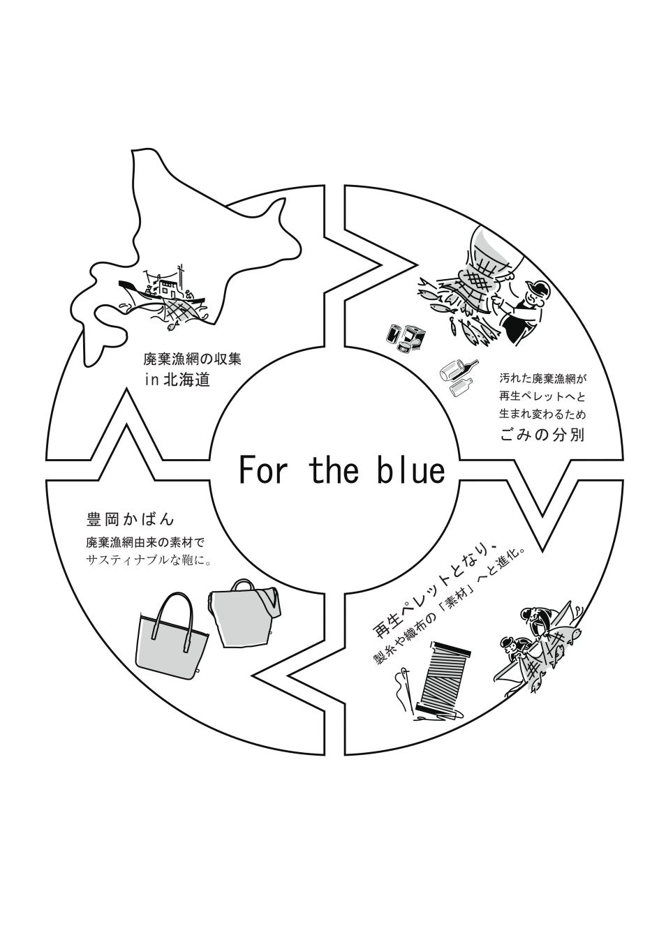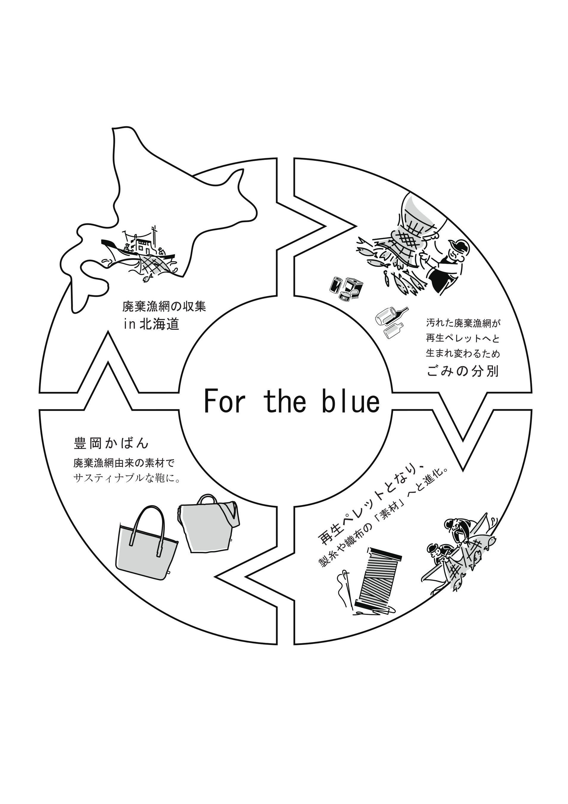 北海道の道東エリアで回収した「廃棄漁網」を採取し、漁網とゴミの分別や洗浄をし、原料となる「再生ペレット」を製造します。複数企業との協働を経て「製糸・織布」と生まれ変わった後にバッグへと生まれ変わります。