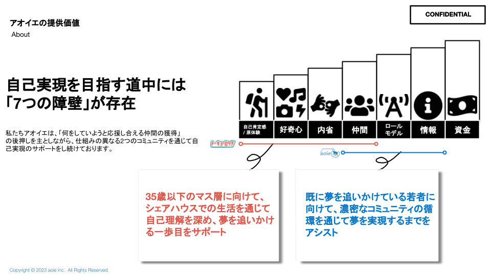 その中でアオイエは、「自己実現や夢を目指す人は道中で7つの障壁に直面する」「アオイエにおいては一定の内省力や対話力を持つ人に対して、仲間・ロールモデル・情報 の障壁を乗り越える部分で一定の価値提供を発揮できている」という仮説を立てています。