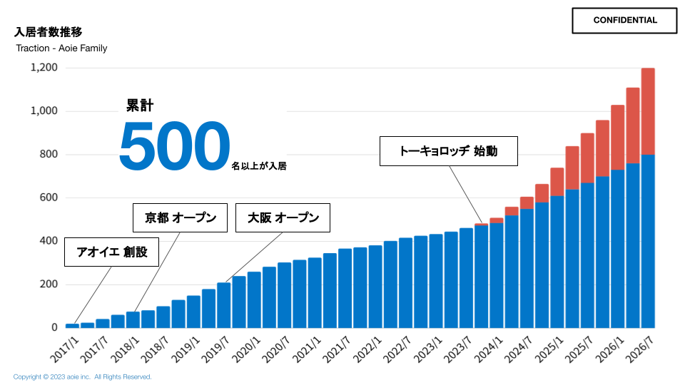 2016年の創設以降、夢を描く若者を対象として、東京・大阪・京都・沖縄で歴代23物件の「コミュニティハウスアオイエ」を展開。「自己実現のインフラ」をビジョンに掲げるコミュニティハウスアオイエでは、同じ住まいに住むだけでなく、住人同士のコミュニケーションを重視し、各業界の第一線で活躍する経営者や政治家、作家から住人が学ぶ年10回のアオイエゼミや毎週金曜日に開催される住民・ゲストの交流会「金アオ」など、さまざまなコンテンツが用意され、夢を描く人たちが金銭面やチャンスの不平等に悩まず、まっすぐに夢を追いかけられる空間を提供しています。起業家・アーティスト・学生アスリートから、企業に勤める社会人や学生まで、実に多種多様な総勢500人のアオイエファミリーを輩出。