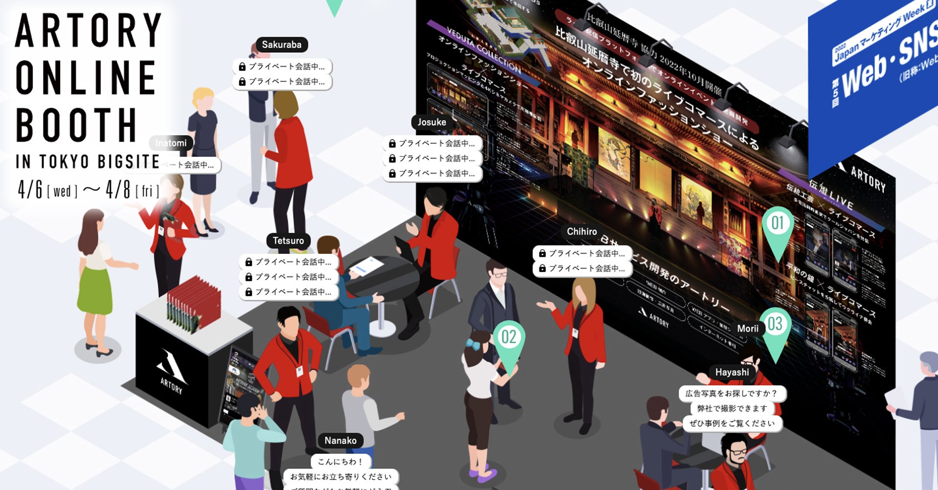 株式会社アートリー(英語表記:ARTORY INC.、所在地:愛知県名古屋市中区、代表:佐藤丈亮)は、7月6日(水)~7月8日(金)の3日間、東京ビッグサイトで開催される『第14回 Japan マーケティングWeek 夏(第5回 Web販促EXPO)』への出展(ブース番号:M9-45)に伴い、自社開発するアイソメトリックデザインのバーチャルマップ型プラットフォームで、現実の出展ブースをオンラインにも反映させて、現実でもオンラインでもブースの“リアルなライブ感”を楽しめる顧客体験の提供に挑戦します。