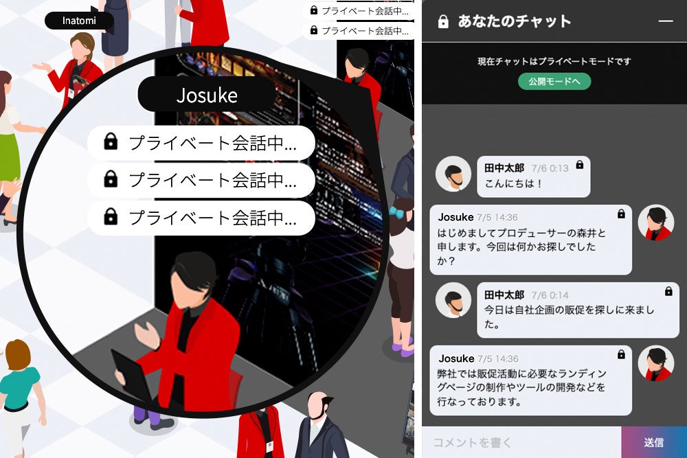 リアルタイムにチャットの公開範囲を切り替えれるので、いきなりビジネスの相談も可能!プライベートモードのチャットはオンラインブース上で、鍵のアイコンと共に「プライベート会話中…」と表示され、会話の秘密性が守られます。