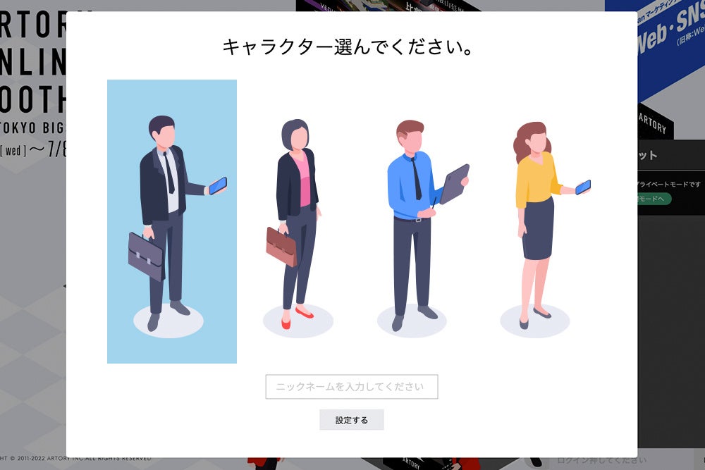 キャラクターを選択してニックネームを入力。オンラインブース上にアバターが出現し、チャットに参加できます。