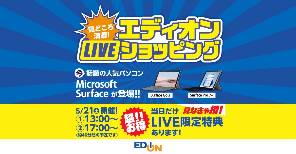 株式会社エディオン(代表:久保 允誉、所在地:大阪市北区)は、2022年5月21日(土)にクラウド型ライブコマースサービスを活用した新たな販売を実施いたします。同社では初めての取組で、インターネット配信によるリアルタイムの販売手法により、第一弾としてMicrosoft Surfaceのパソコン2アイテムを紹介・販売する予定。