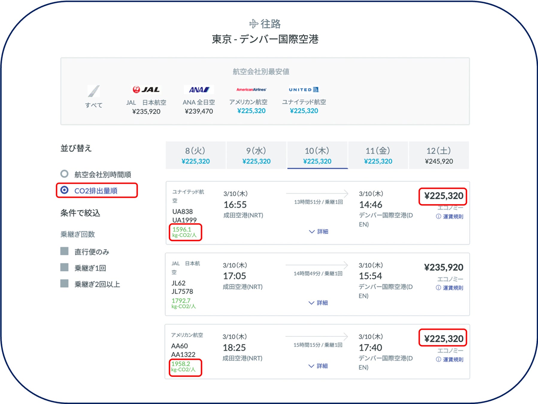 (例)画面・同額でもフライトや乗り継ぎ地によってCO2排出量が変わる(イメージ)