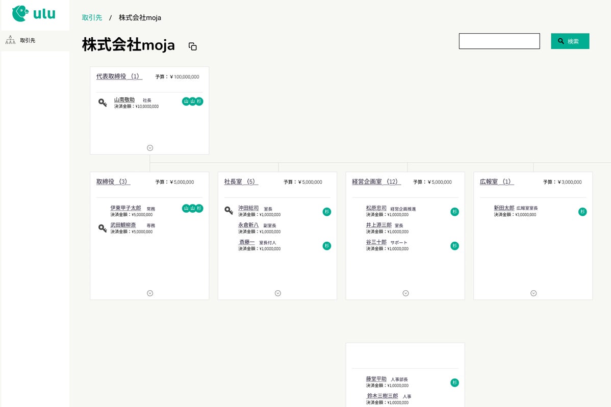 『ulu』は組織図作成の自動化と決裁情報を簡単に整理できる、営業向けクラウドソフトウェアです。弊社独自の技術を用いて、名刺管理サービスSansanとの連携や所定のCSVデータをインポートするだけで、自動で特定企業の組織図が作成されます。また、物件・案件ごとの決裁ルートの作成にも対応予定で、特にエンタープライズセールスのような、煩雑で面倒な案件の決裁ルートを簡単に整理できます。