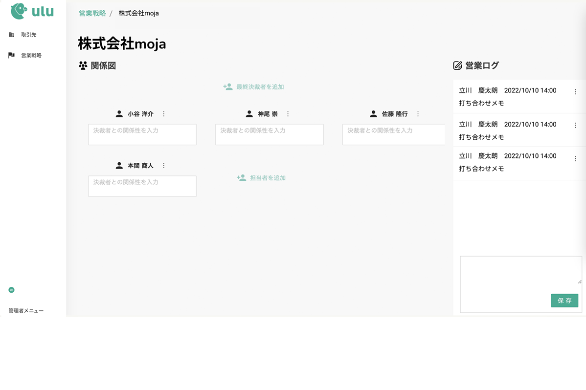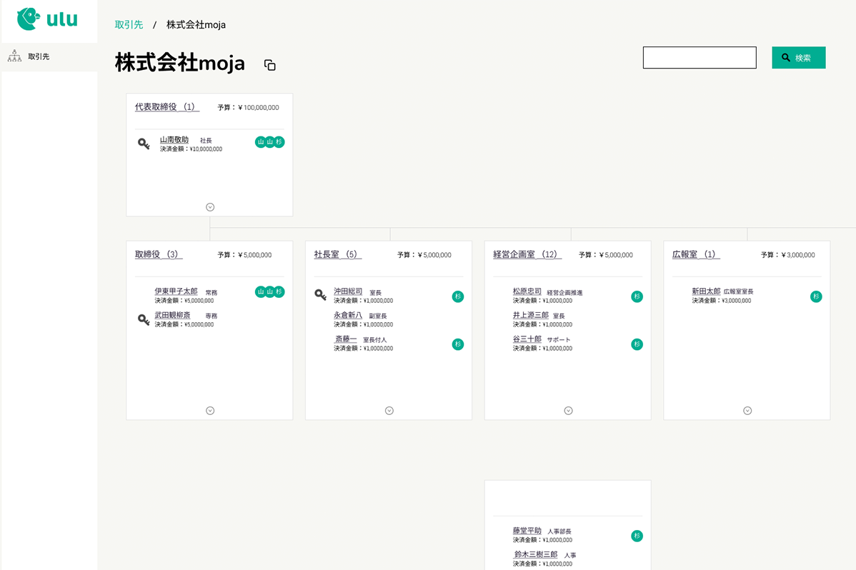 『ulu』は組織図作成の自動化と決裁情報を簡単に整理できる、営業向けクラウドソフトウェアです。弊社独自の技術を用いて、名刺管理サービスSansanとの連携や所定のCSVデータをインポートするだけで、自動で特定企業の組織図が作成されます。また、物件・案件ごとの決裁ルートの作成にも対応予定で、特にエンタープライズセールスのような、煩雑で面倒な案件の決裁ルートを簡単に整理できます。