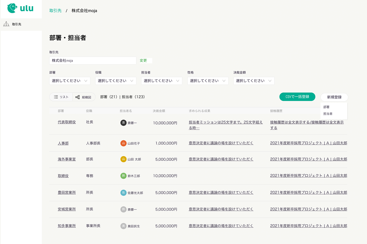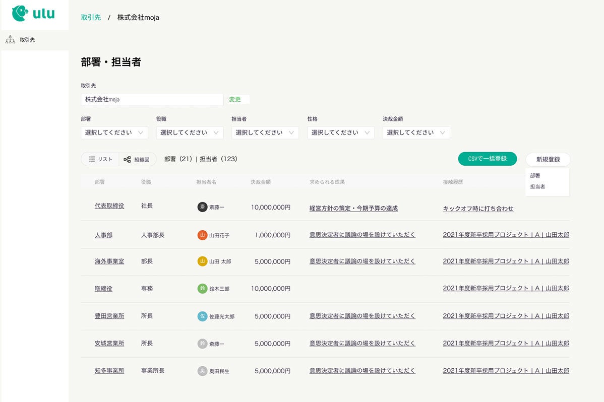 今まで名刺データとリストで確認していたコンタクト先は膨大な時間の割に生産性が著しく低い現状がありました。uluで自動解析された組織図ツリーによって、攻略できていない予算や担当者が明確になり、関連部署や上長との会議生産性が向上。売上拡大を実現できています。今後の営業システムとの連携を期待しています。
