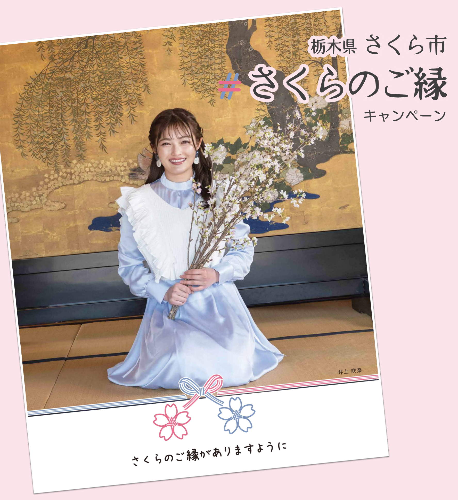 この度「さくらのご縁」に合わせてタレント井上咲楽さんをさくら市にお招きして写真撮影を行いました。キャンペーンポスター3種類を制作して、栃木県内外首都圏に掲示するほか、本プレゼントキャンペーン告知にも登場します。お楽しみに!