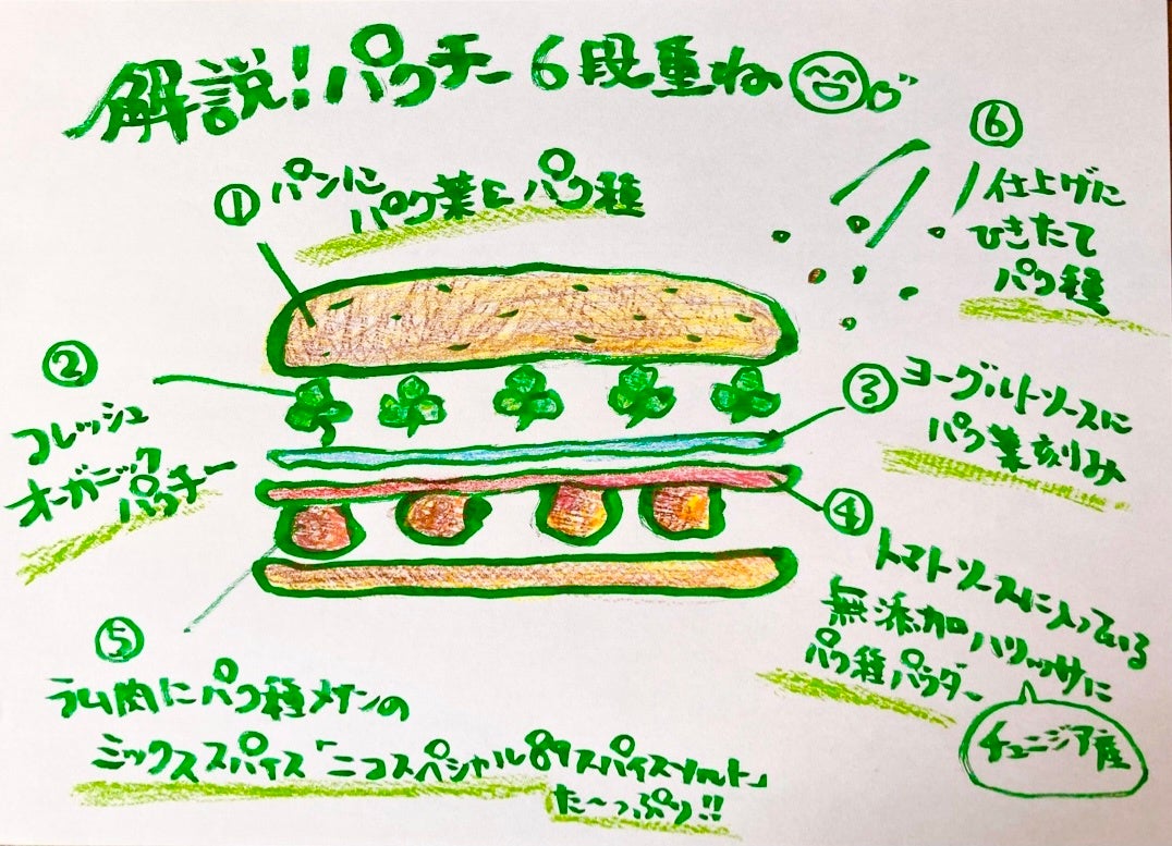パクチーが旬の時期に、パクチーをより楽しめるメニューを提供できないかと、パクチー農家様と当店の架け橋をして頂いている「旅するパクチー」の牛田うっしぃさんに相談したところ一緒にメニュー開発して頂ける事になりました。構想から5か月、nicoバインミー店長と何回も何回も試作試食を繰り返し、今まさに旬の春パクチーの季節に間に合いました。『パクチー6段重ねラムハンバーグバインミー』はパクチー好きさん曰く、食べるほど笑顔になれるバインミーとの事。パクチー好きさんも、パクチーに一度チャレンジしてみたい皆様も、パクチーをふんだんに使った『パクチー6段重ねラムハンバーグバインミー』を是非一度食べてみて下さい。