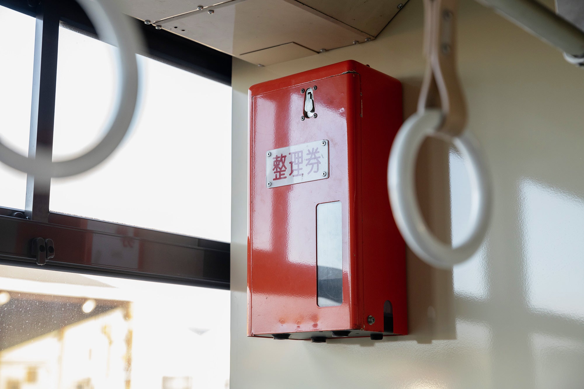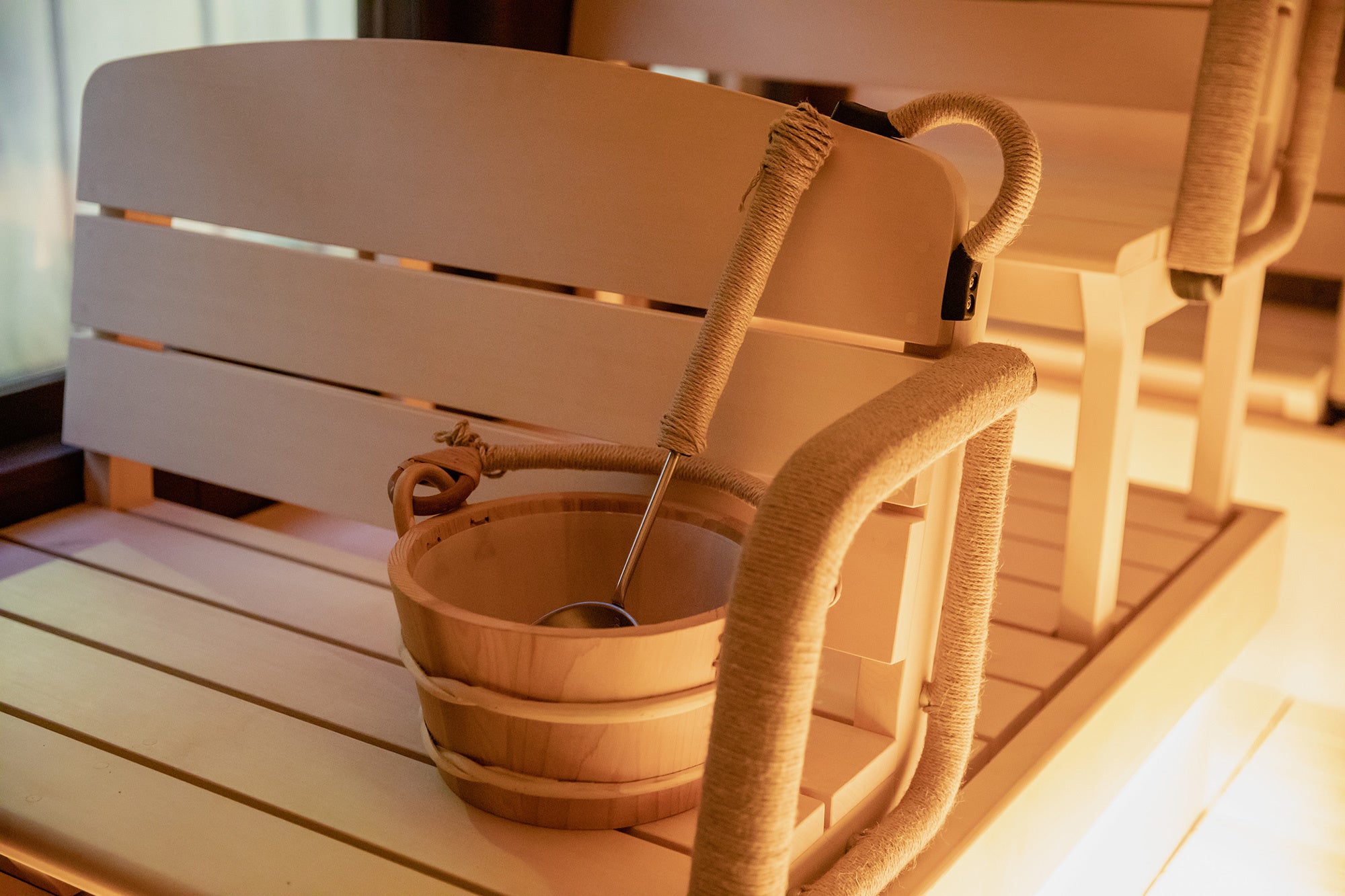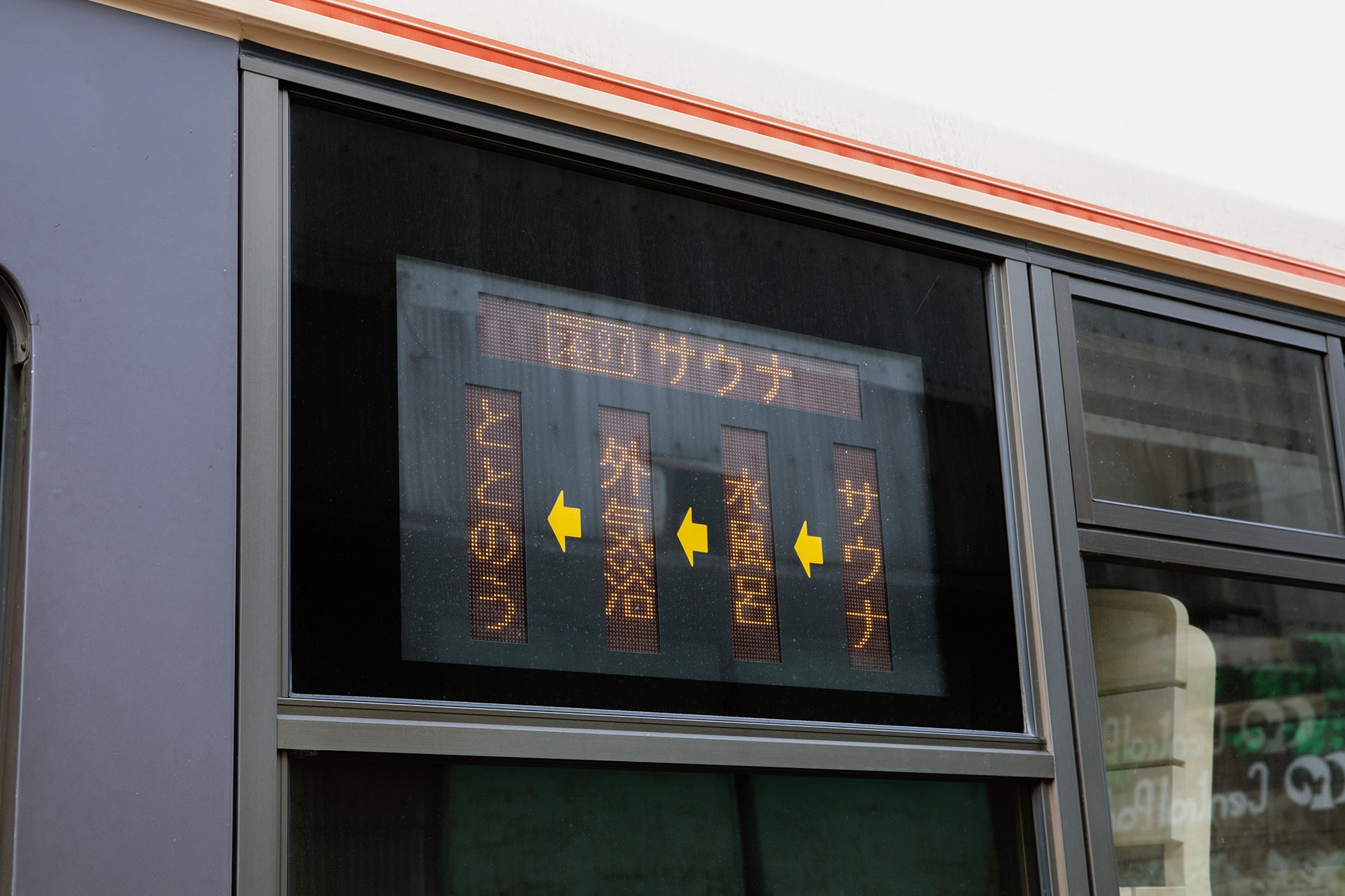 また、吊り革やサウナ室のロウリュ用の給水タンクとして再活用した整理券ボックス、バスのエアコンをモチーフにした照明など改造前の名残がある空間となっています。