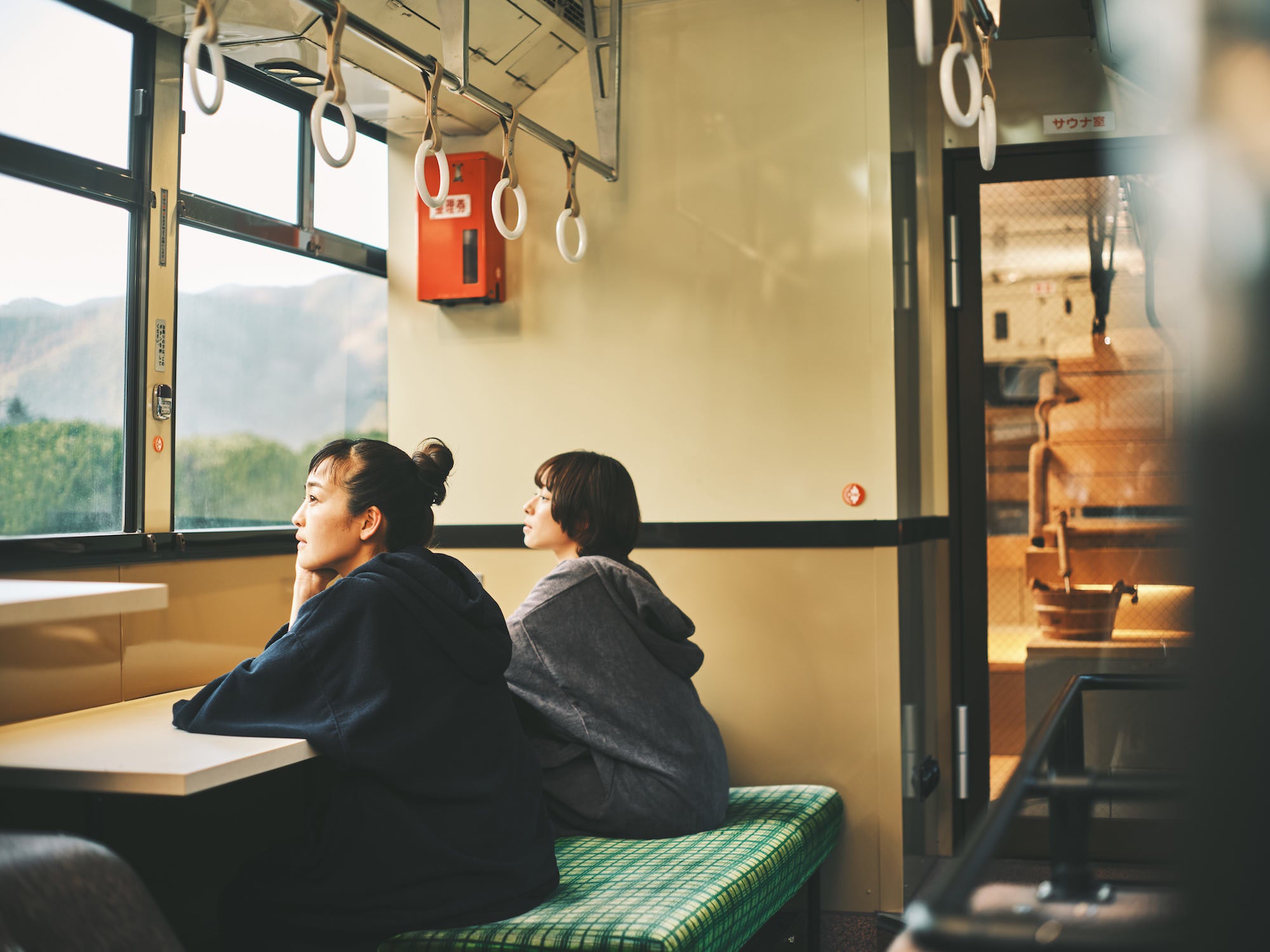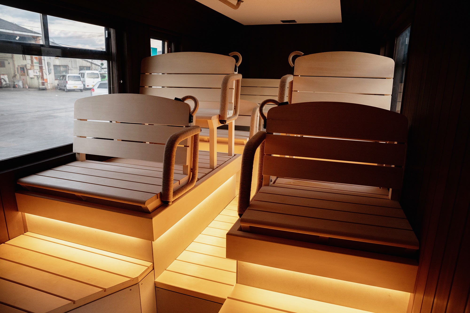 バス前方のスペースはバスの座席シートを再利用した椅子、外が眺めるカウンターテーブルがあり、サウナ前の手荷物置きやサウナ後の休憩にご利用いただけます。