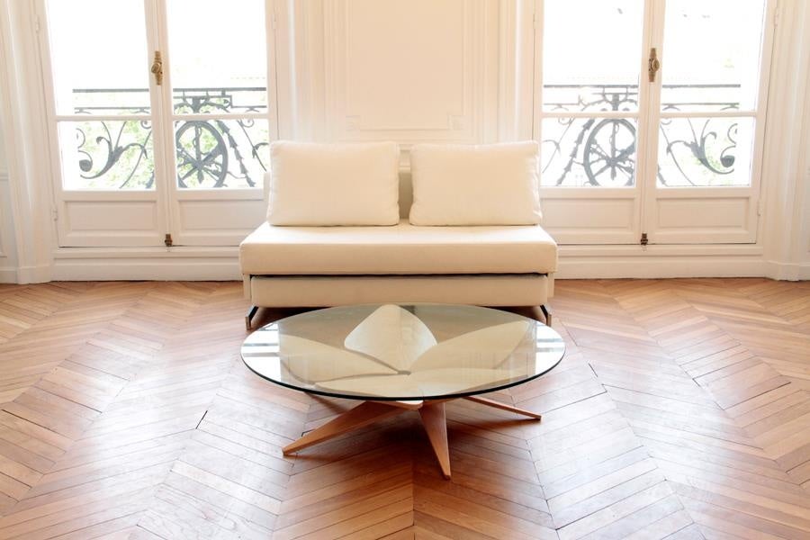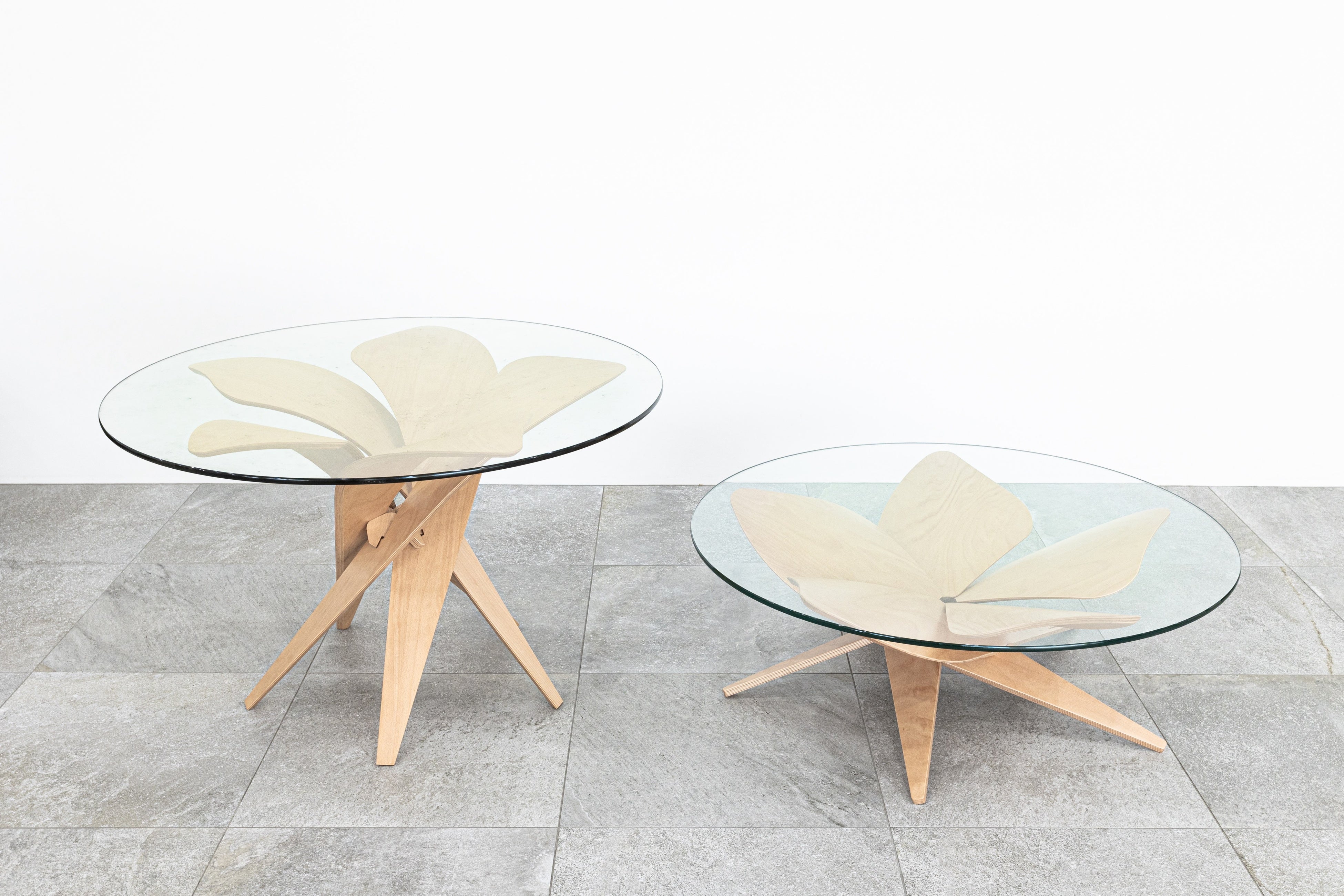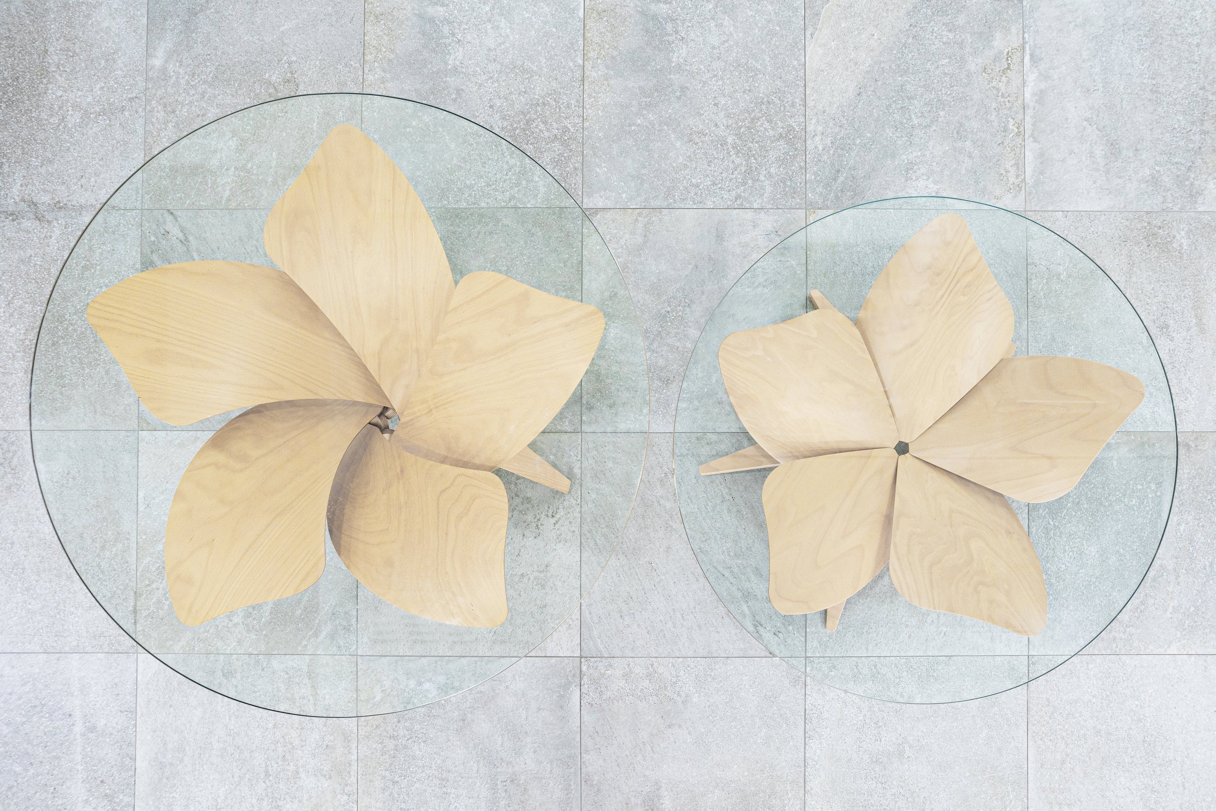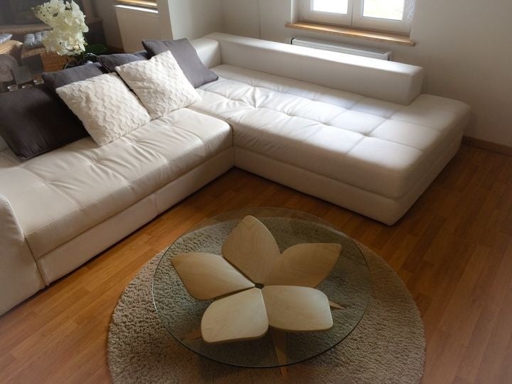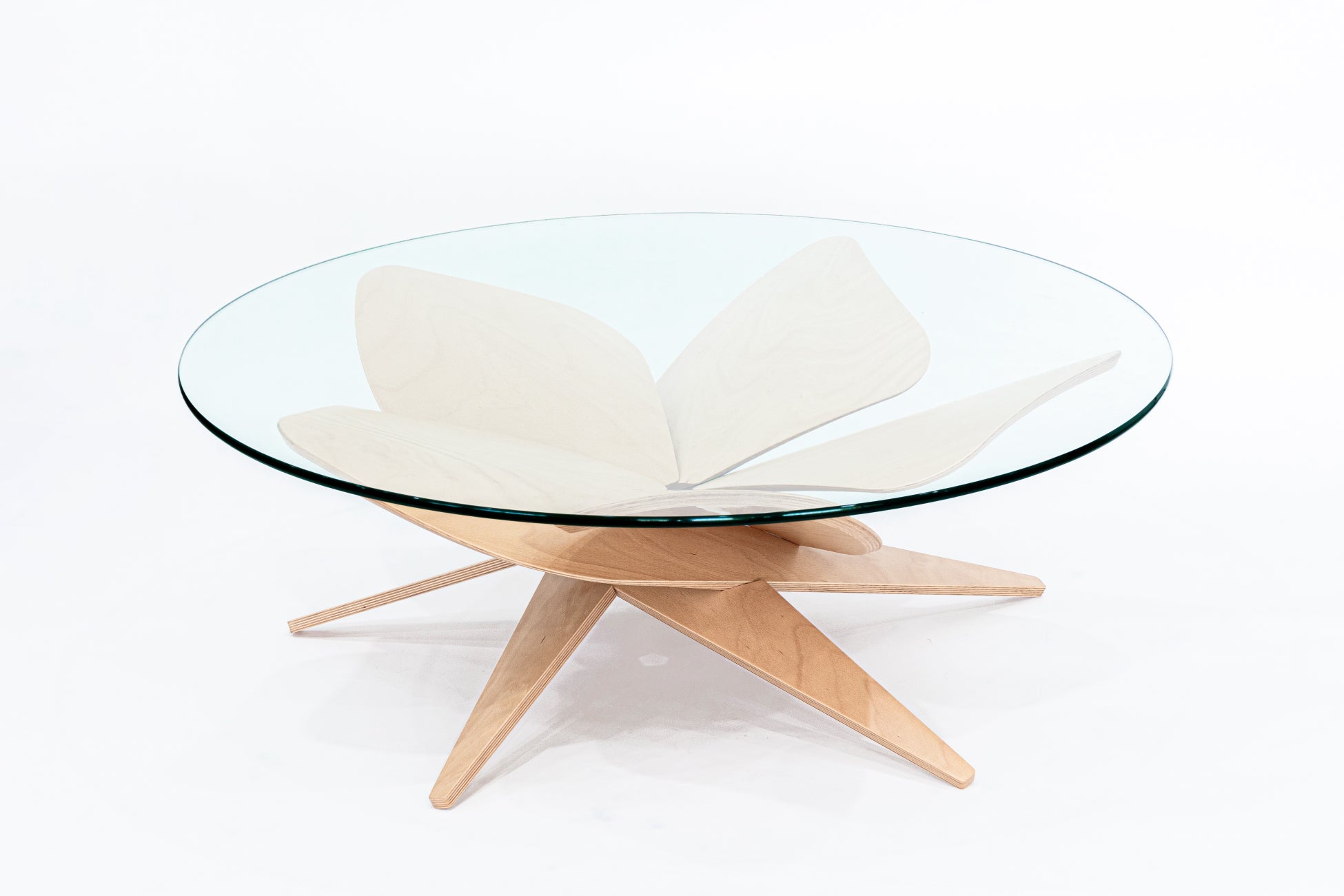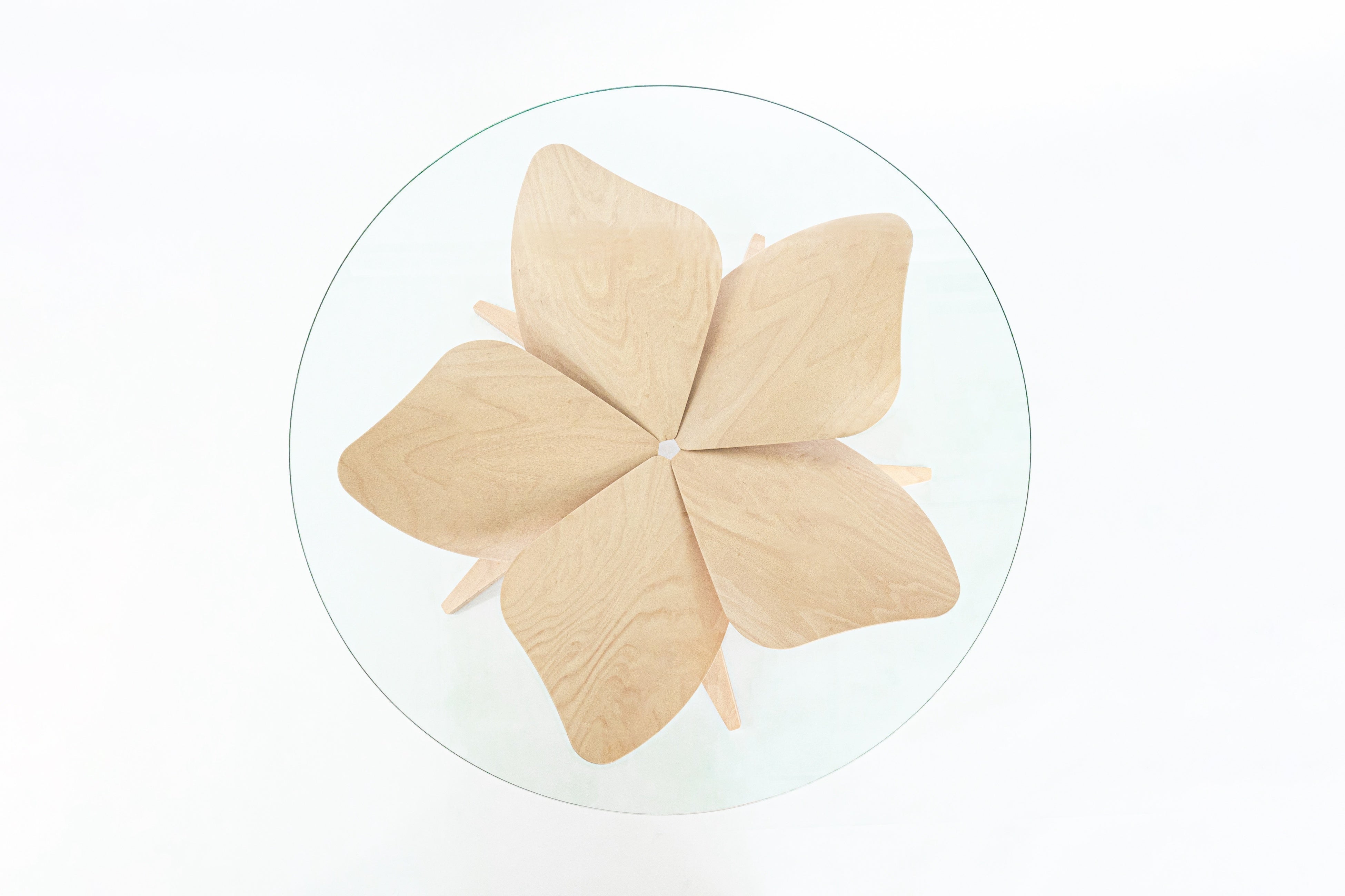 Hana table SAKURAは、5枚の花びらを模した木材をスパイラル状に組み合わせて、その上にガラス板を載せただけのシンプルなテーブルです。この写真で見ていただくとわかるように、ネジや釘などは一切使っておりません。一つ一つの花びらが折り重なるようにして組んでいます。