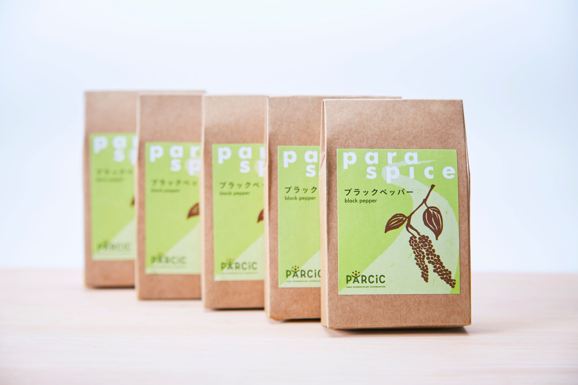 商品デザインは、摘む前のたわわに実ったブラックペッパーの実(手前)と伸びてゆく、つながってゆくパーラ(道)のイメージ(後ろ)