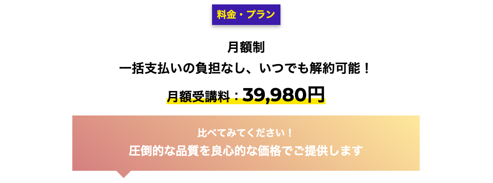 従来のプログラミングスクールでは、多額の受講料を一括で支払う必要があり、十分な返品もしてもらえません。また、受講期間も3ヶ月、6ヶ月と短く、期日になれば学習途中であっても継続することができません。