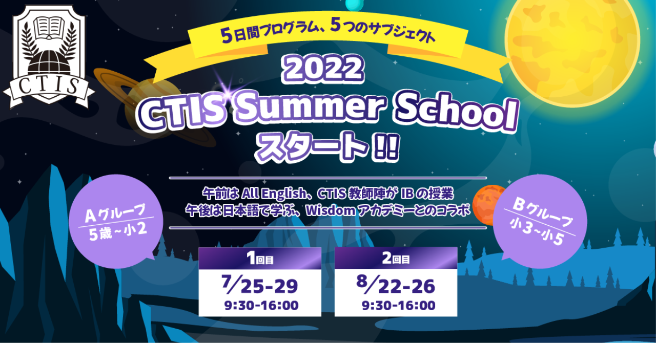 南麻布のインターナショナルスクールが幼児年長(K5)~小5(G5)を対象のサマースクールを2022年7月25日(月)~29日(金)および8月22日(月)~26日(金)に実施します。午前中は英語ネイティブのCTIS教師による授業、午後はウィズダムアカデミーの講師による体験型日本語授業を行います。