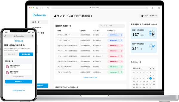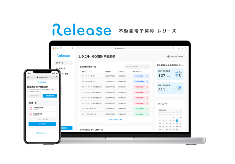 レリーズは2022年5月の宅地建物取引業法改正、並びにそれに伴う国土交通省の運用方針等に準拠した内容で2022年6月以降にサービスを開始する予定で、事前登録をいただくことで3ヶ月間基本利用料無料でご利用いただけるほか、さまざまな特典をお届けいたしております。当社は本サービスを通じて、「不動産取引のオンライン化」によるDX推進・お客さまの購入体験向上を目指してまいります。
