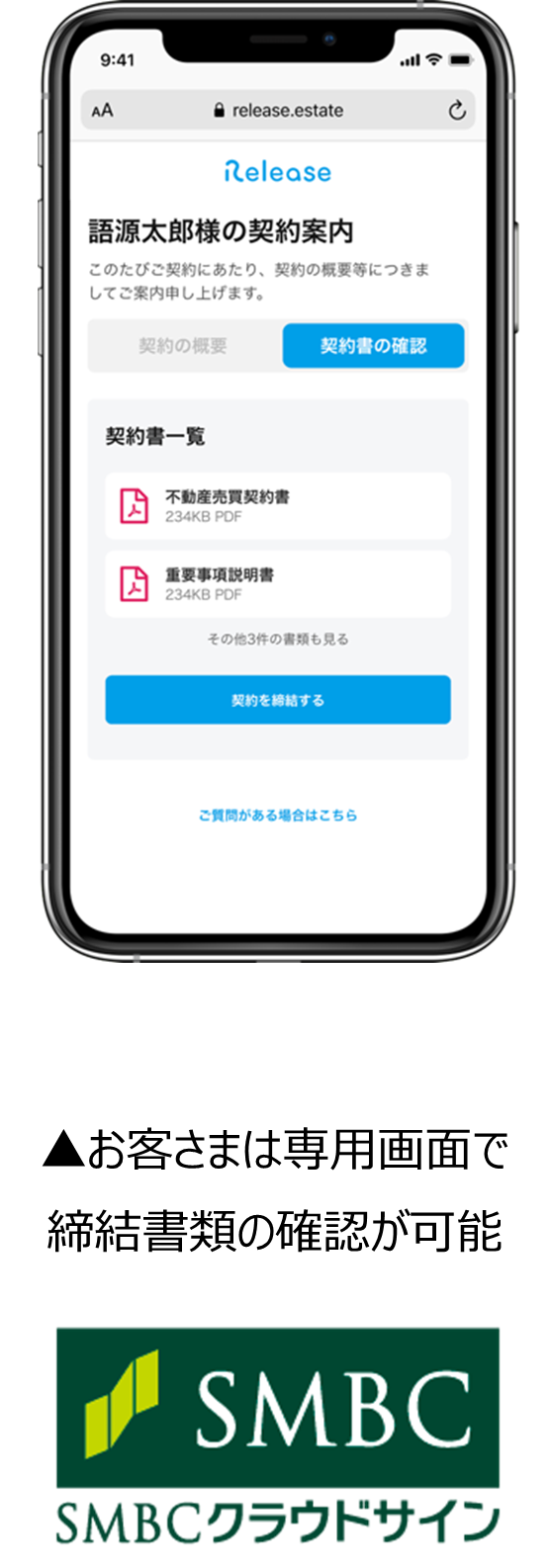 電子契約対応により売買契約時のお客さまの印紙代負担が無くなるほか、レリーズは電子契約導入にともなう不動産事業者さまからお客さまへのご案内にも配慮した設計思想。契約の事前案内から契約書の受け渡しまでを行える、お客さま側の専用画面をご用意しております。レリーズを導入いただくことで、取引時におけるお客様の安心感、満足感を向上させます。