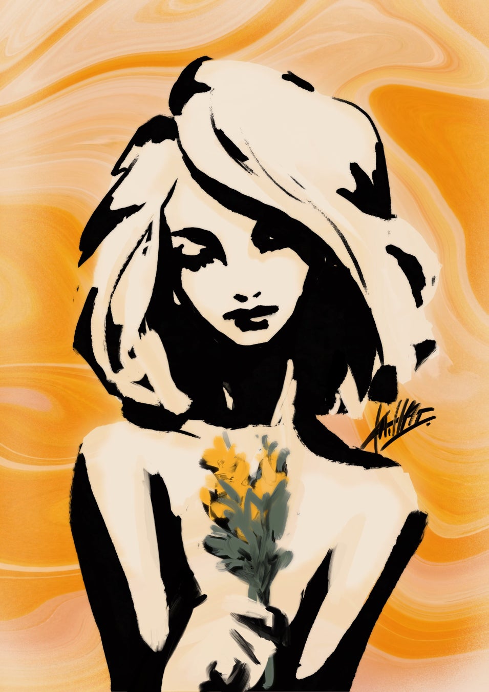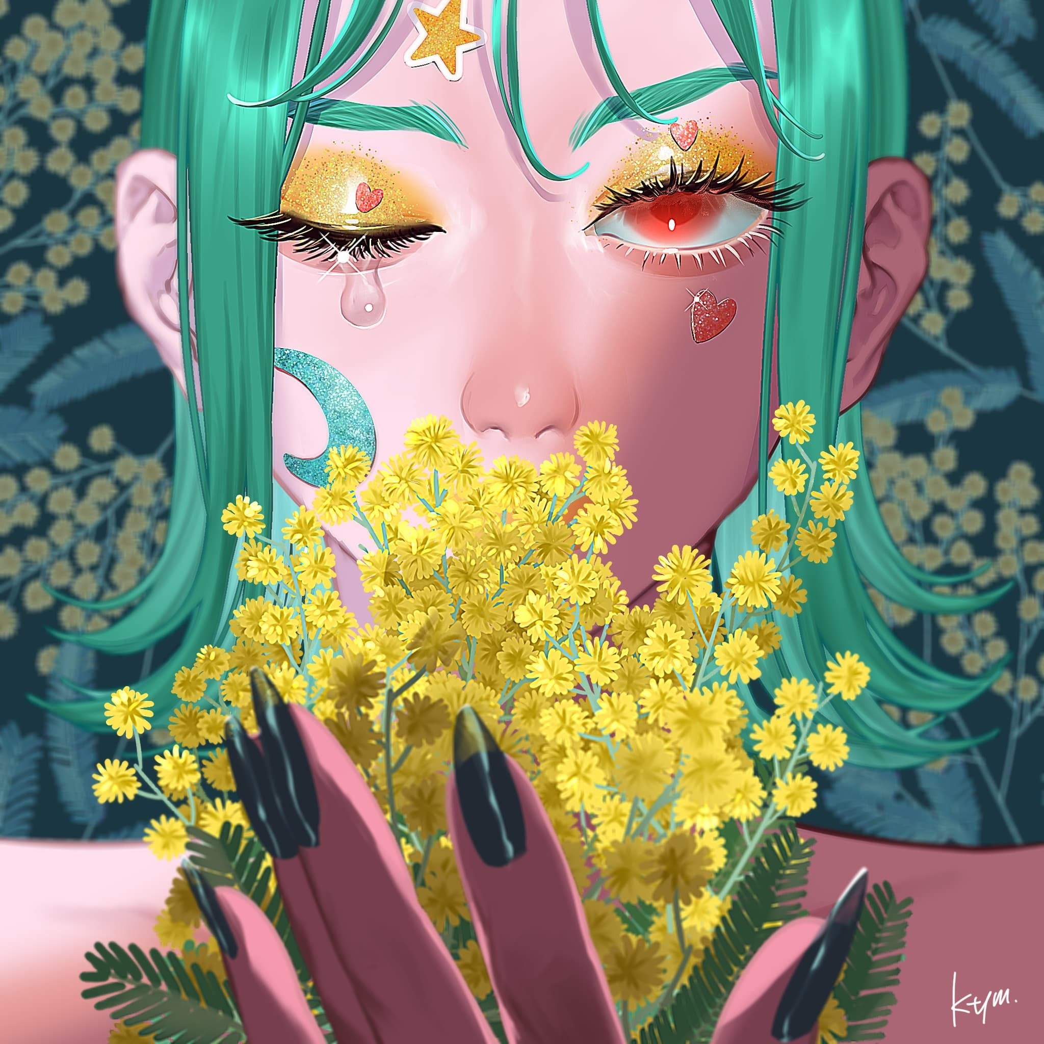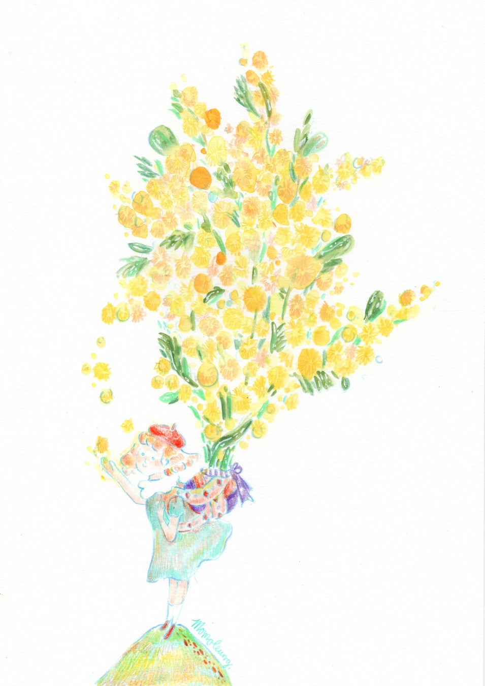 ミモザの花の黄色は、私の目には小さな太陽のように映ります。丘の上の少女はこの花を集め、その光を分かち合いました。