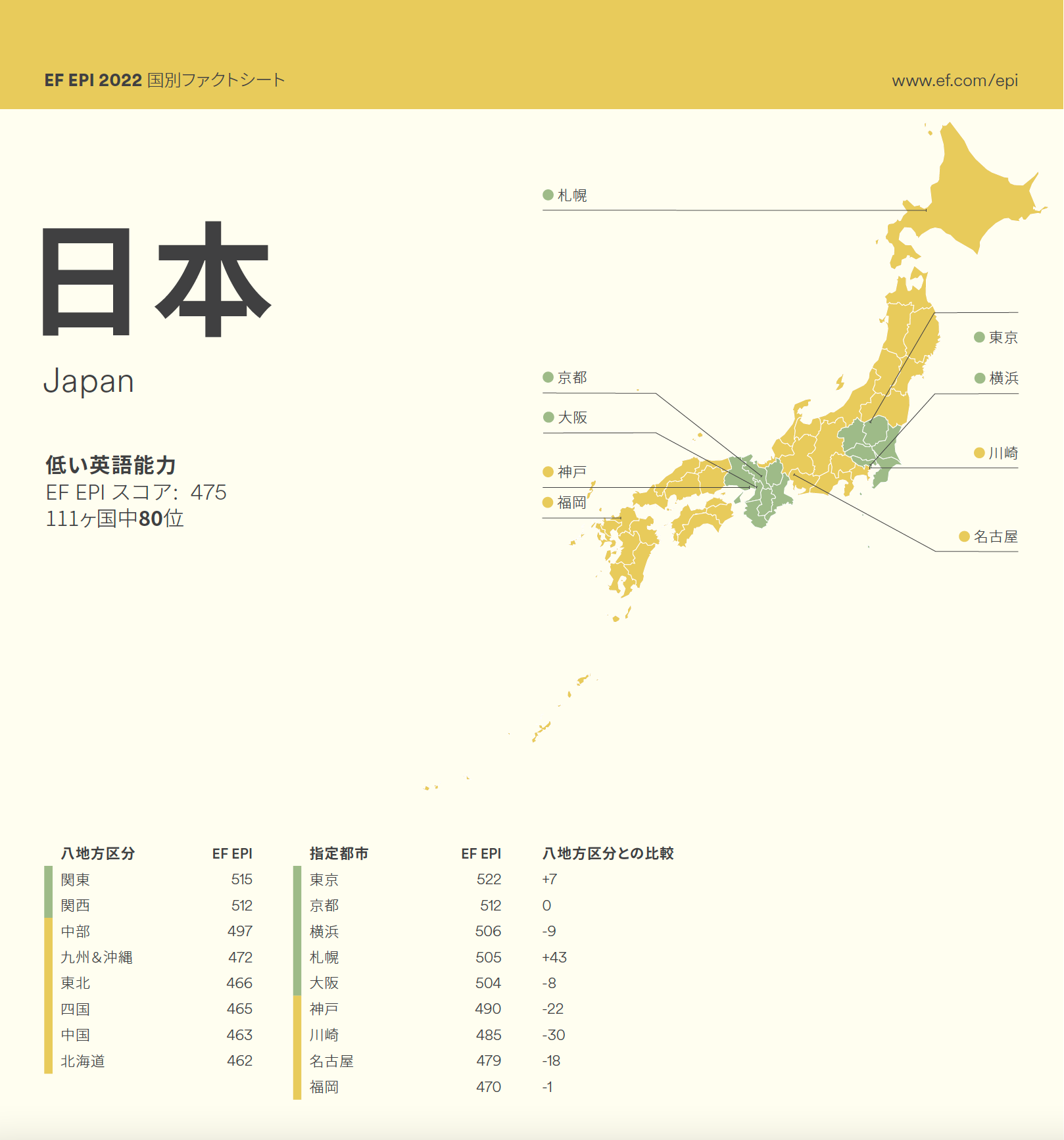 〇 EF EPI 英語能力指数<2022年版>の主なポイントは以下の通りです: