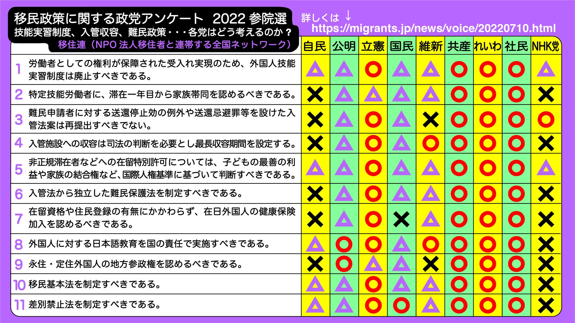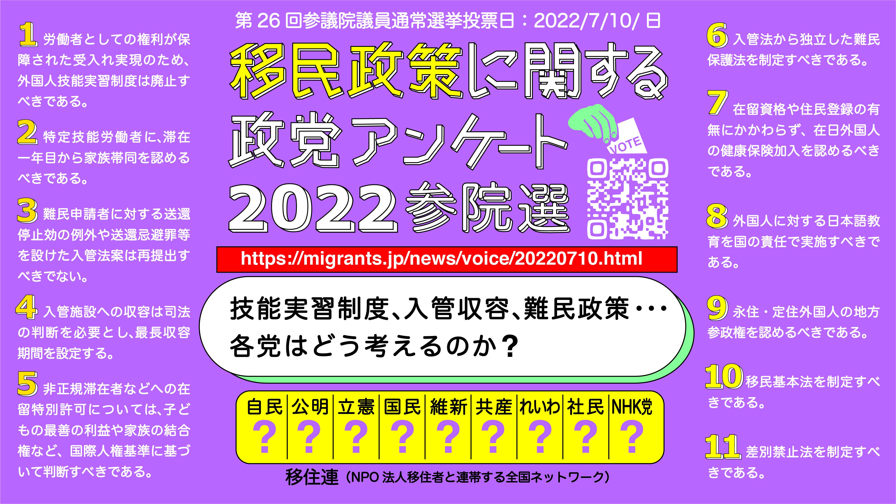 移住連(NPO法人移住者と連帯する全国ネットワーク)は、与野党9政党(自由民主党、公明党、立憲民主党、国民民主党、日本維新の会、日本共産党、れいわ新選組、社会民主党、NHK党)に対して「移民政策に関する政党アンケート2022参院選」を実施いたしました。