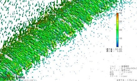 3Dフルウェーブ電磁界解析例(図中矢印は磁場ベクトルを示す)