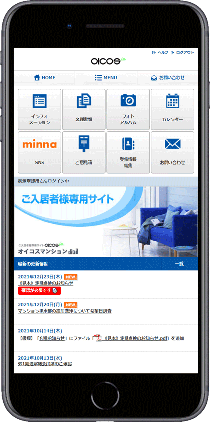 マンション内専用のSNS機能です。様々なコミュニティ設定も可能ですので、目的に応じて安心して交流をはかることができます。マンション内の良好なコミュニティ形成を支援、防犯、防災にも貢献します。