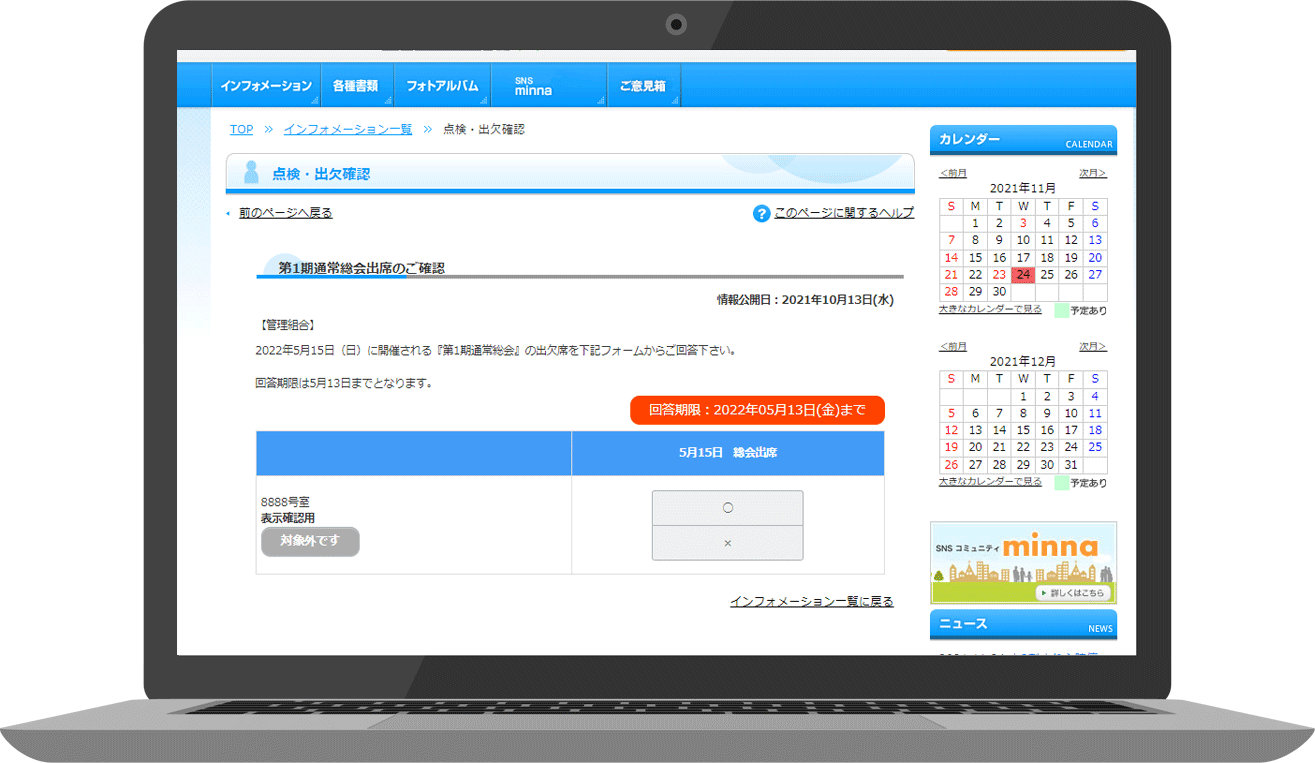 各住戸の希望をオンラインで募ることが可能。紙で回収する手間も省けます。また理事会や専門委員会開催時の役員の予定の調整にもご利用いただけます。