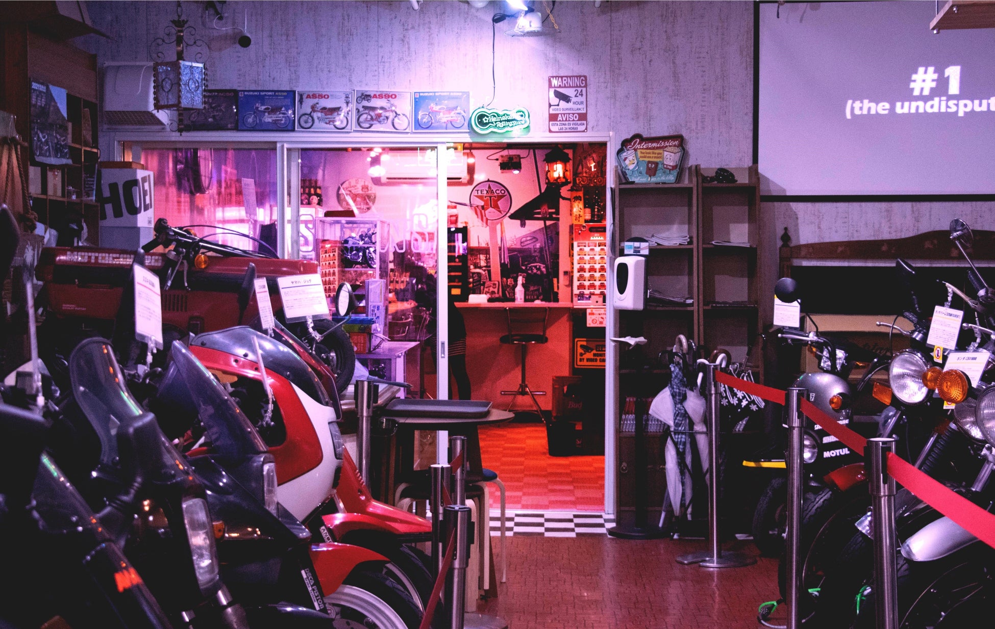 20台のバイクが店頭に立ち並ぶカフェ。店主の気分で入れ替わるバイクは売り物ではなく展示品。1台700万円を超える名車のほか、バイカーに人気の漫画のコラボヘルメットがショーケースで飾られているなど貴重なグッズも。