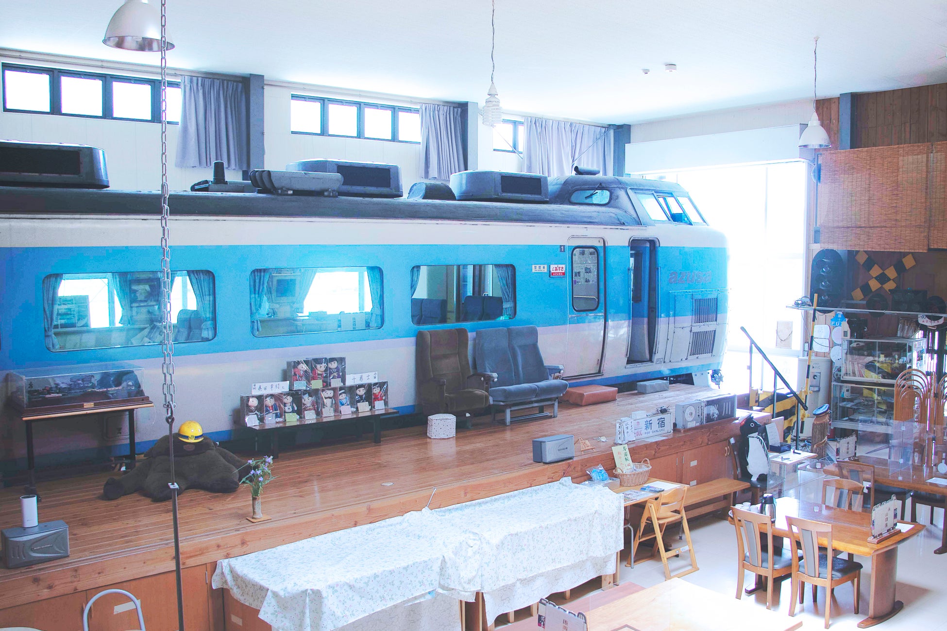 実際に新宿~松本間を走っていた特急あずさ号を居抜きにした鉄道車両の宿泊施設。ドアの開閉・車内放送・警笛も可能。