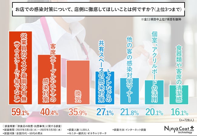 そこで、「お店での感染対策について、店側に徹底してほしいことは何ですか?(上位3つまで)」と質問したところ、『従業員のマスク着用の有無(マウスシールド等でない)(59.1%)』と回答した方が最も多く、次いで『客席(テーブルやいす)の感染対策(40.4%)』『換気(35.9%)』と続きました。