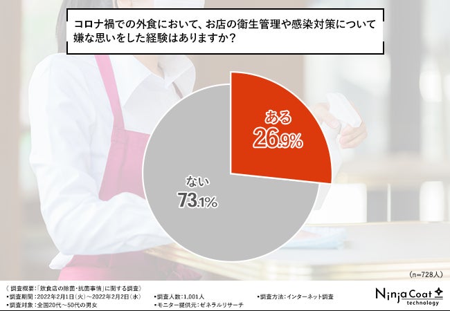 そこで、「コロナ禍での外食において、お店の衛生管理や感染対策について嫌な思いをした経験はありますか?」と質問したところ、『ある(26.9%)』『ない(73.1%)』との結果となりました。