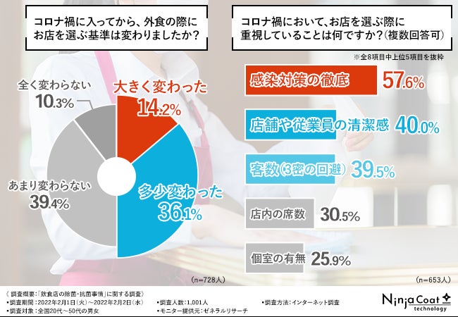 そこで、「コロナ禍に入ってから、外食の際にお店を選ぶ基準は変わりましたか?」と質問したところ、『大きく変わった(14.2%)』『多少変わった(36.1%)』『あまり変わらない(39.4%)』『全く変わらない(10.3%)』との結果となりました。