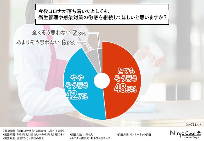 そこで、「今後コロナが落ち着いたとしても、衛生管理や感染対策の徹底を継続してほしいを思いますか?」と質問したところ、『とてもそう思う(48.5%)』と回答した方が最も多く、次いで『ややそう思う(42.7%)』『あまりそう思わない(6.5%)』と続きました。