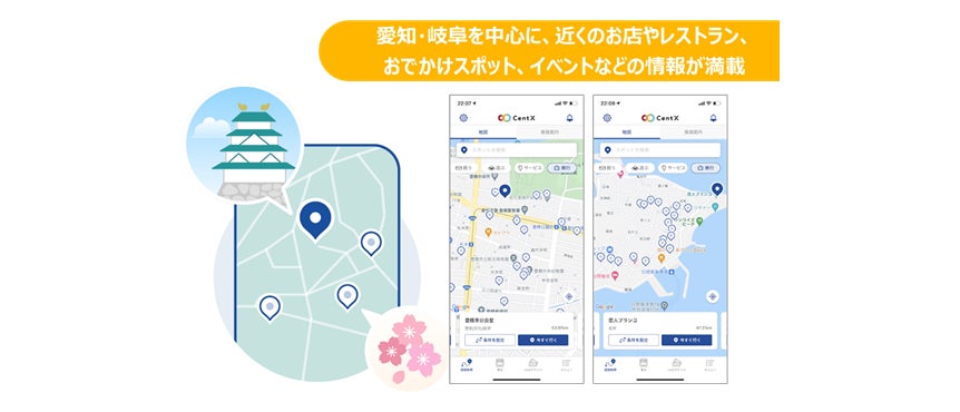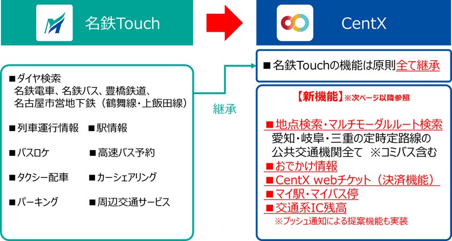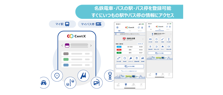 この「CentX」では、名鉄Touchの機能に加え、最適な移動手段をご案内する「地点検索・マルチモーダルルート検索」や各種チケットの購入・決済が可能となる「CentX webチケット」などの機能を提供し、沿線・地域の交通・生活・観光サービスをシームレスでストレスフリーに繋ぎ、地域の皆さまの「おでかけ」に役立つさまざまな利便性の高い情報を提供します。