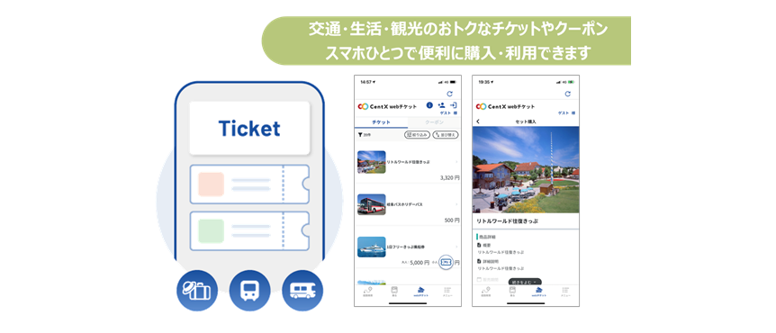 アプリの経路検索結果から、鉄道などの移動と観光がセットになったチケット、バスや船舶で利用可能なフリーきっぷなどをキャッシュレスでシームレスに購入が可能です。また、旅先で使えるお得なクーポンも利用できます。