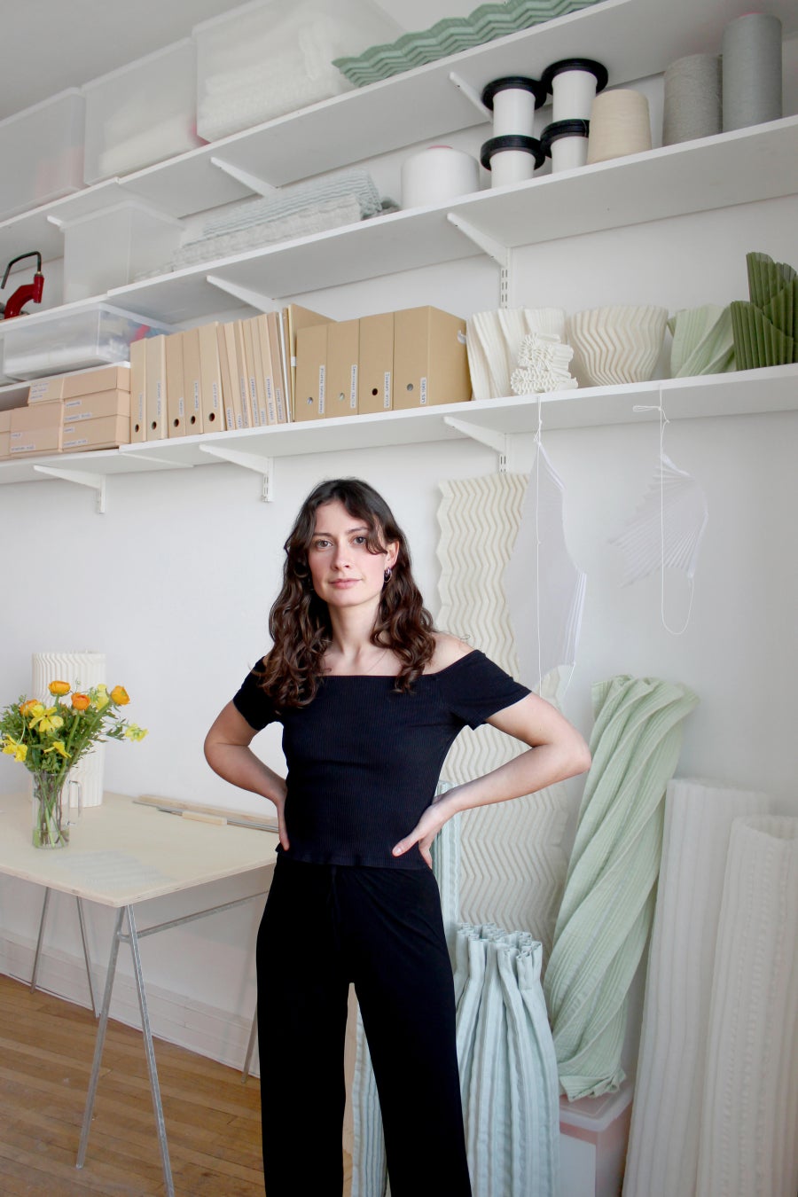 ジュリエット・ベルトノーはパリを拠点に活動するフランス人テキスタイルデザイナーであり織り手です。織りやプリーツの技法を駆使し、立体的で触感に富んだ革新的な素材を生み出しています。文化機関やラグジュアリーブランド、建築家、ギャラリーとの協働を通じて、舞台美術やウィンドウディスプレイ、特注作品を制作。産業用ジャカード織機を実験的に用い、自立性を持つ彫刻的なテキスタイルを開発し、音響や断熱の特性を備えつつ、ボリュームと軽やかさ、構造と柔らかさの調和を探究しています。さらに責任ある繊維の使用や端材の再利用、地域循環型の生産など、持続可能な実践にも注力。活動はデザイン、アート、建築を横断し、分野を越えた協働を育んでいます。2023年にはパリ市よりグランプリ・ドゥ・ラ・クレアシオン(デザイン部門・新進気鋭)を受賞。
